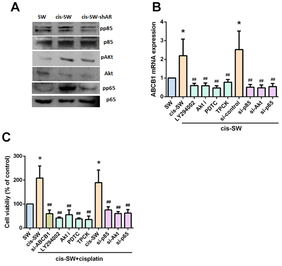 Phosphatidylinositol 3-kinase (PI3K) signaling stimulates cancer cell growth and survival, motility and metabolism [26]. The PI3K, Akt, and nuclear factor kappa-light-chain-enhancer of activated B cells (NF-κB) signaling cascade is one of the main canonical pathways implicated in cancer pathogenesis, including chemoresistance [27–29]. We therefore examined whether the PI3K/Akt/NF-κB pathway is involved in AR-mediated ABCB1 expression and chemoresistance. We observed increased levels of PI3K, Akt and NF-κB phosphorylation in cis-SW cells and decreased levels in cis-SW-shAR cells, compared with levels in SW1353 cells (Figure 4A). Pretreatment of cis-SW cells with a PI3K inhibitor (Ly294002), an Akt inhibitor (Akt i), or NF-κB inhibitors (PDTC and TPCK), or transfection with p85, Akt, p65, and ABCB1 siRNAs decreased AR-mediated ABCB1 expression and cell viability (Figure 4B, 4C), suggesting that the PI3K, Akt, and NF-κB signaling pathways mediated AR-increased resistance to cisplatin.