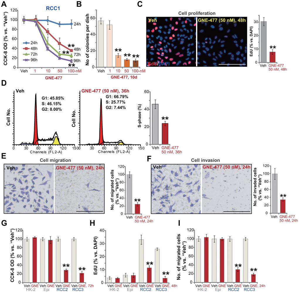 GNE-477 potently inhibits human RCC cell survival, proliferation, cell cycle progression, migration and invasion