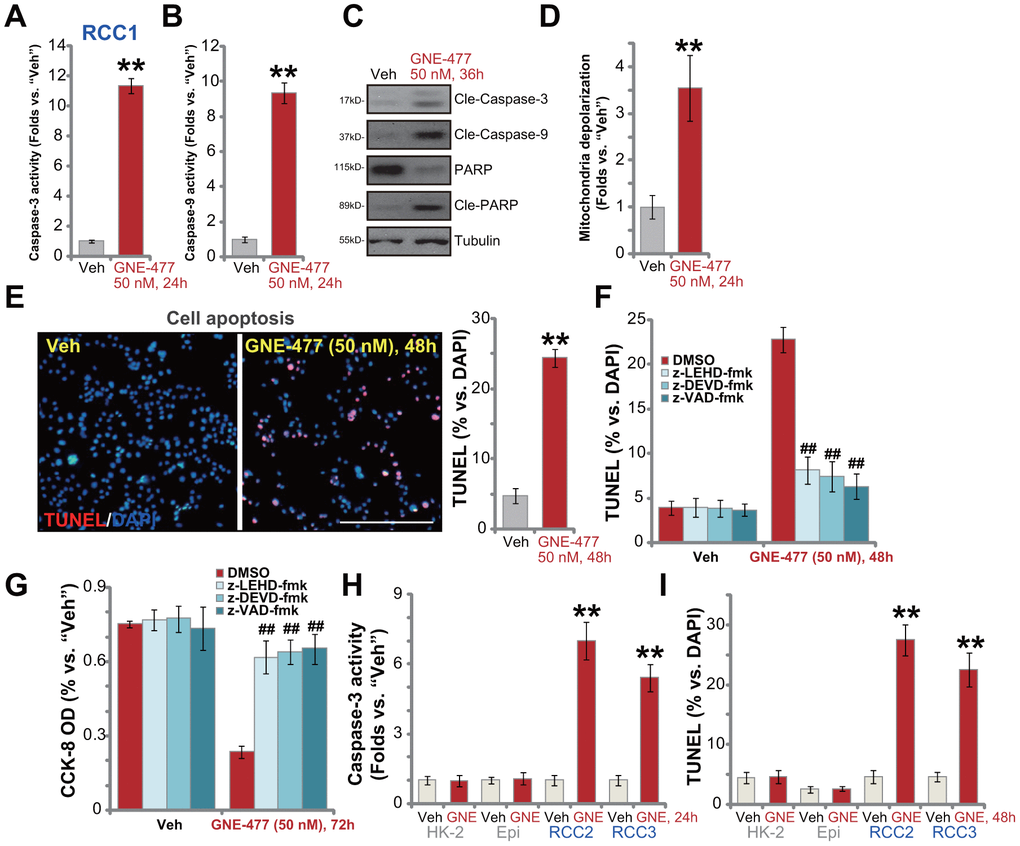 To confirm that apoptosis is the primary cause of GNE-477-induced cytotoxicity in RCC1 cells, a set of different caspase inhibitors were utilized. As demonstrated, pretreatment with the caspase-3 inhibitor z-DEVD-fmk, the caspase-9 inhibitor z-LEHD-fmk, or the pan-caspase inhibitor z-VAD-fmk, potently ameliorated GNE-477-induced apoptosis activation (TUNEL assay) in RCC1 cells (Figure 2F). Consequently, GNE-477-induced cytotoxicity, evidenced by CCK-8 viability reduction, was largely inhibited (Figure 2G). In other primary human RCC cells (RCC2 and RCC3), treatment with GNE-477 (50 nM) led to robust caspase-3 activation (Figure 2H) and nuclear TUNEL ratio increase (Figure 2I), indicating apoptosis activation. On the contrary, the dual PI3K-mTOR inhibitor failed to provoke significant apoptosis in HK-2 cells and primary kidney epithelial cells (Figure 2H, 2I). Together, these results show that GNE-477 induced robust apoptosis activation in primary human RCC cells.