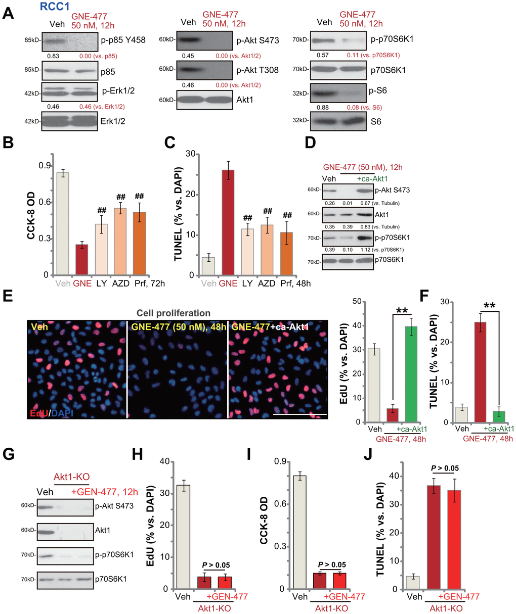 Further studies demonstrated that a constitutively-active Akt1 (ca-Akt1) restored Akt and p70S6K1 phosphorylation in GNE-477-treated RCC1 cells (Figure 3D). Importantly, GNE-477-induced proliferation inhibition (EdU ratio decrease, Figure 3E) and cell apoptosis activation (nuclear TUNEL ratio increase, Figure 3F) were completely reversed by caAkt1 (Figure 3E, 3F). Therefore, forced activation of Akt reversed GNE-477-induced cytotoxicity in RCC1 cells, suggesting that PI3K-Akt-mTOR inhibition should be the cause of GNE-477-induced cytotoxicity against RCC cells. To further support our hypothesis, the CRISPR/Cas9 strategy was applied to complete knockout (KO) Akt1 in RCC1 cells (see Methods). Akt1 KO, mimicking GNE-477-induced activity, blocked Akt and p70S6K1 phosphorylation (Figure 3G), and led to robust viability reduction (Figure 3H), proliferation inhibition (Figure 3I) and cell apoptosis activation (Figure 3J). Importantly, in Akt1-KO RCC1 cells, adding GNE-477 (50 nM, 48h) was unable to induce further cytotoxicity (Figure 3H, 3I). These results further supported that GNE-477-induced cytotoxicity in RCC cells was due to PI3K-Akt-mTOR blockage.