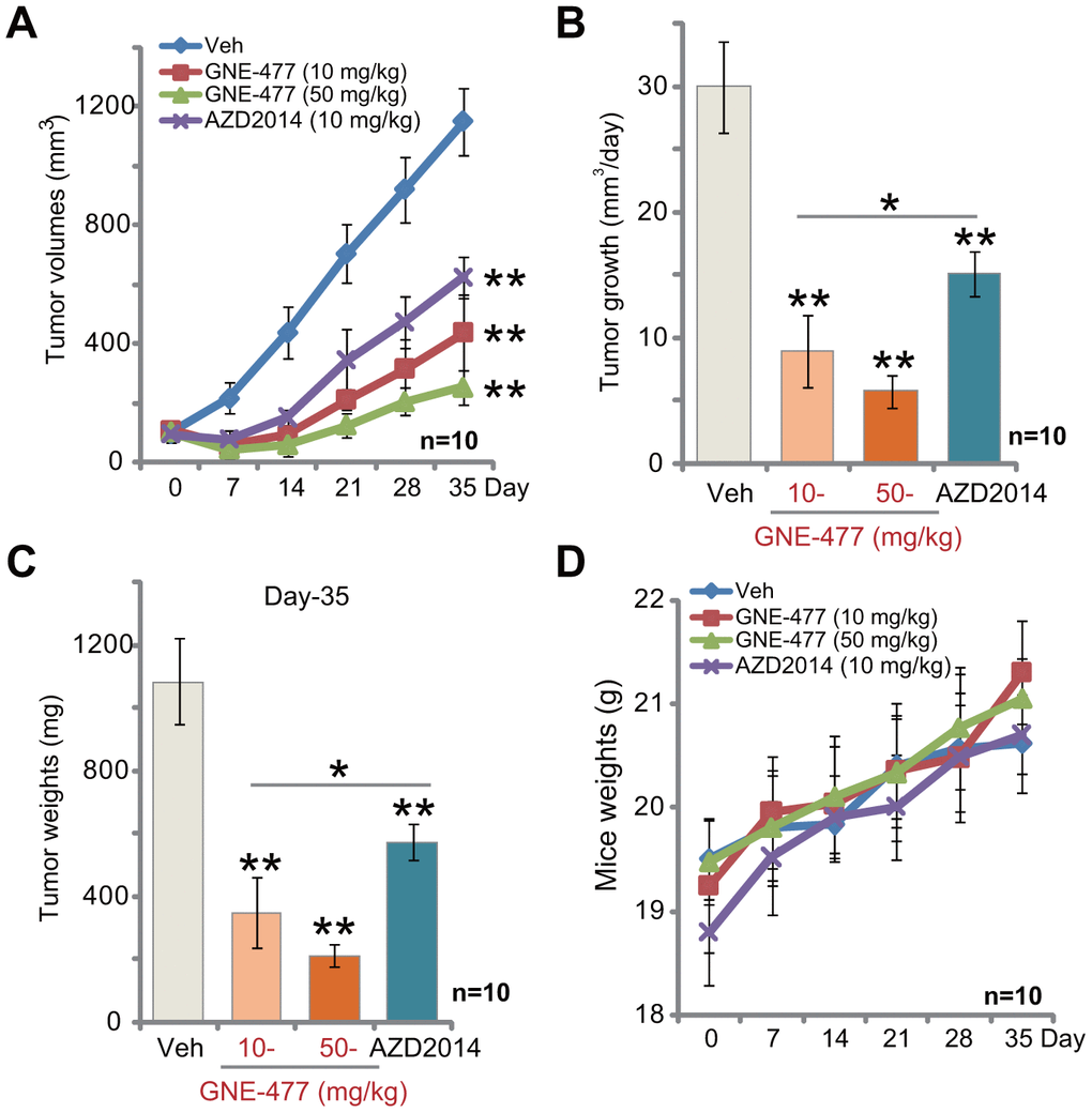 Notably, at the dose of 10 mg/kg (i.p. daily for three weeks) the known mTOR kinase inhibitor AZD2014 [19–21] significantly inhibited RCC1 xenograft tumor growth in mice (Figure 4A–4C). Importantly, GNE-477 was more potent in suppressing RCC1 xenograft growth than the same concentration of AZD2014 (Figure 4A–4C). There was no significant difference in animal body weights among the four groups (Figure 4D). Furthermore, no apparent toxicities were noticed in GNE-477-treated mice and AZD2014-treated mice. These results confirmed that GNE-477, at well-tolerated doses, potently inhibited RCC1 xenograft tumor growth in mice.