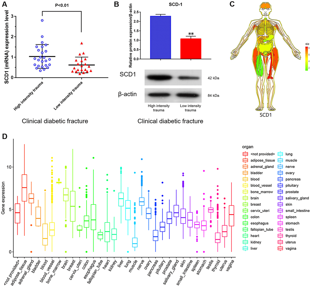 SCD1 expression levels in purified human BM-MSCs from diabetic patients with high-energy fracture (controls) and diabetic patients with low-energy fracture were examined by quantitative real-time PCR. Patients with high-energy fracture (sustained mainly in traffic accidents) were equivalent to the normal control group (diabetic patients with good bone quality and no fracture), and those with low-energy fracture (such as that sustained in falls) were equivalent to the diabetic bone disease group. This grouping was based on ethical considerations, as the collection of bone marrow and bone tissue samples from healthy individuals would not be ethical. The results showed that average SCD1 expression level was significantly lower in diabetic patients with low-energy fracture than in controls (Figure 1A, 1B). To understand the expression of these genes in the human body more intuitively, we constructed human tissue–enriched protein expression maps using the data from the GTEX database (http://www.bio-info-trainee.com/3705.html), which contains bone marrow data from autopsy specimens obtained from subjects who were healthy before death (e.g., traffic accident victims). The results showed that SCD1 was highly enriched in bone (Figure 1C, 1D). Therefore, our findings emphasize the expression of SCD1 may be associated with low-energy fracture risk in diabetics.