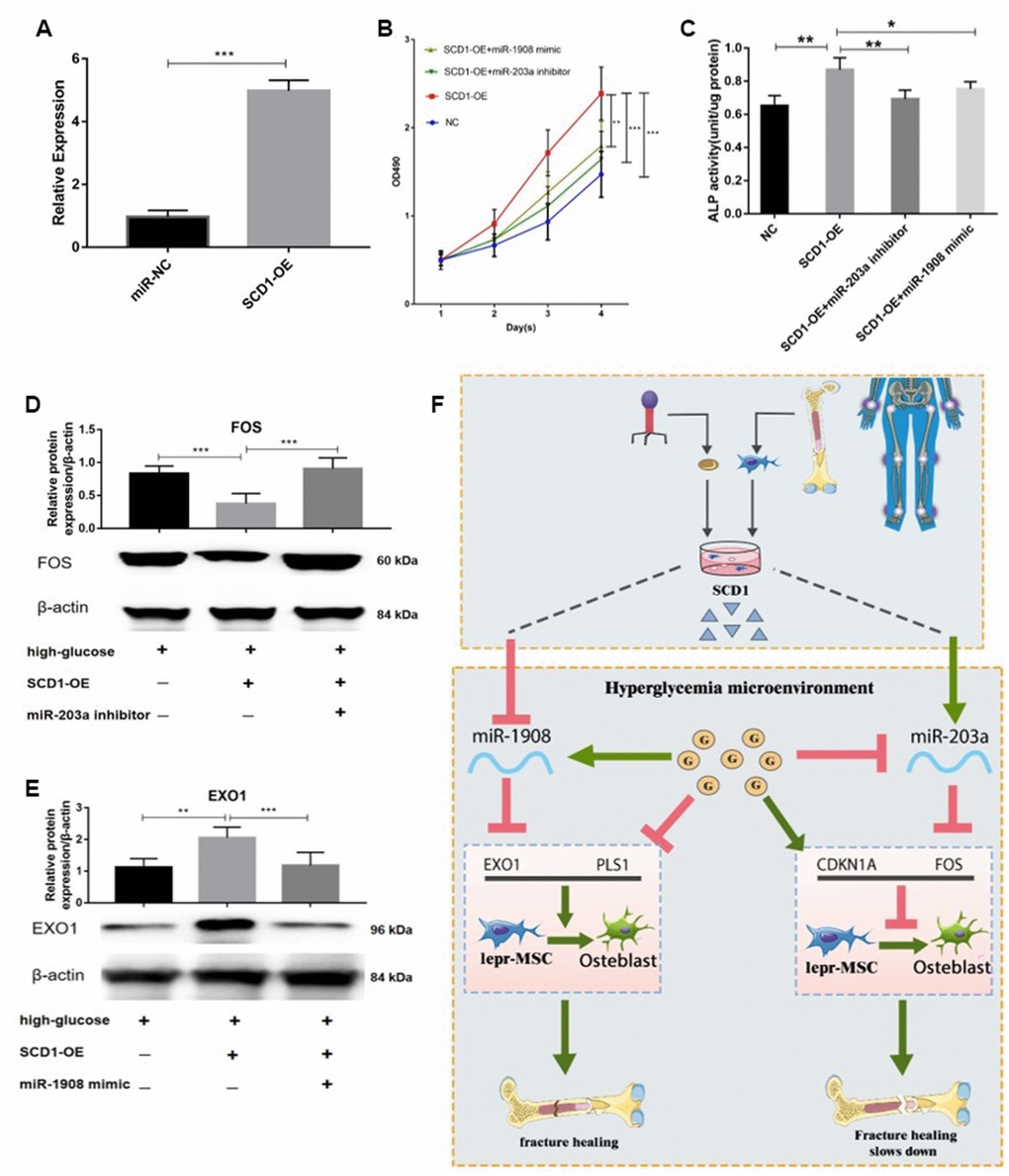 First we confirmed the transfection efficiency of SCD1 in BM-MSC cells (Figure 10A). The proliferation of BM-MSCs was then evaluated after overexpression of SCD1 and co-transfection with the miR-203a inhibitor or miR-1908 mimic. Cells transfected with SCD-1 showed significantly increased proliferation compared with the others, whereas proliferation was decreased in cells treated with the miR-203a inhibitor and miR-1908 mimic (Figure 10B). Similar effects were observed for ALP activity; miR-1908 markedly reduced the ALP level, whereas miR-203a played a protective role (Figure 10C). Western blots showed significantly reduced FOS expression and increased EXO1 expression in SCD1-overexpressing cells, whereas the expression of FOS was increased by treatment with the miR-203a inhibitor, and the combination of SCD1-OE and miR-1908 mimic resulted reduced the expression of EXO1 to control levels (Figure 10D, 10E). Therefore, MiR-203a/FOS pathway may be repressed and the MiR-1908/EXO1 pathway could be active in patients with diabetic fracture (Figure 10F). SCD1 may protect bone from fracture in diabetic patients by regulating miRNA expression changes caused by diabetes, such as those in hsa-miR-203a and hsa-miR-1908.
