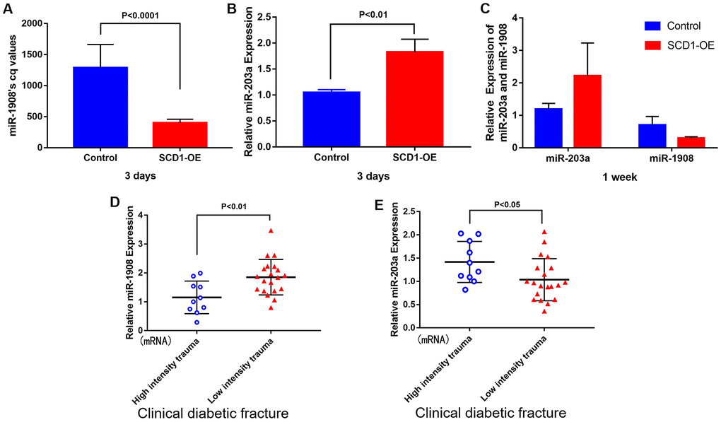 The expression levels of genes acquired from the GSE70318 and GSE25462 datasets are shown in Figure 3A, 3B. GSE70318 provides information on serum miRNA signatures that indicate skeletal fracture and influence osteogenic differentiation of MSCs in post-menopausal women with and without T2DM. GSE25462 is a dataset of miRNAs related to diabetes and skeletal-muscle insulin resistance. We found no miRNA dataset related directly to diabetic bone disease; considering the close relationship between skeletal muscle and bone (and especially fracture risk), and the large size and good quality of the GSE25462 dataset, we used these data in this study (Supplementary Figure 2A–2D). We speculated that the biological effects of SCD1 on skeletal muscle and BM-MSCs were similar. Our experiments revealed that the overexpression of SCD1 led to the overexpression of miR-1908 and miR-203a, confirming this hypothesis. After normalization, the gene distribution was uniform and adequate for further study (Supplementary Figure 2E). Volcano plots of differential expression are presented in Supplementary Figure 2F. For GSE70318 data, hsa-miR-382-3p, hsa-miR-369-3p, hsa-miR-376c-3p, and hsa-miR-1908 were the most upregulated miRNAs and hsa-miR-550a-5p, hsa-miR-203a, and hsa-miR-942 were the most downregulated miRNAs in the diabetic fracture group. In total, 147 DEMs (80 upregulated, 67 downregulated) were obtained from the GSE25462 skeletal muscle samples. Matrix data for differentially expressed from GSE70318 and DEMs from GSE25462 are presented as heatmaps in Figure 3A, 3B.