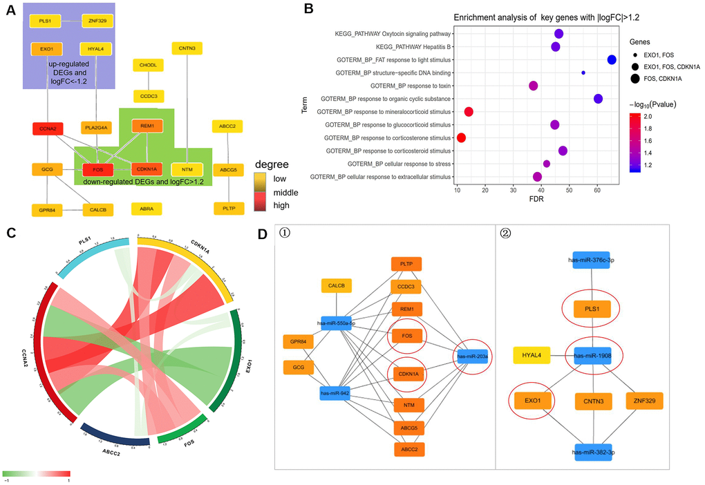 In STRING network analysis, 104 nodes and 86 edges were identified in the GSE25462 data, with a PPI enrichment P value of 8.19e-07 (Supplementary Figure 7). Based on the PPI network, modules were identified, and 19 hub genes were screened out (Figure 6A). FOS, CDKN1A, REM1, NTM, EXO1, PLS1, ZNF329, and HYAL4 played important roles in the network (P < 0.05, |log FC| ≥ 1.2; Figure 6A). According to enrichment analysis, GO functions were associated mainly with responses to corticosterone, mineralocorticoid, glucocorticoid, and corticosteroid stimuli, toxins, extracellular stimuli, and stress. KEGG pathways were associated mainly with oxytocin signaling and hepatitis B (Figure 6B). FOS, CDKN1A and EXO1 were involved in the most enrichment processes, with high degrees of interaction (Table 3).