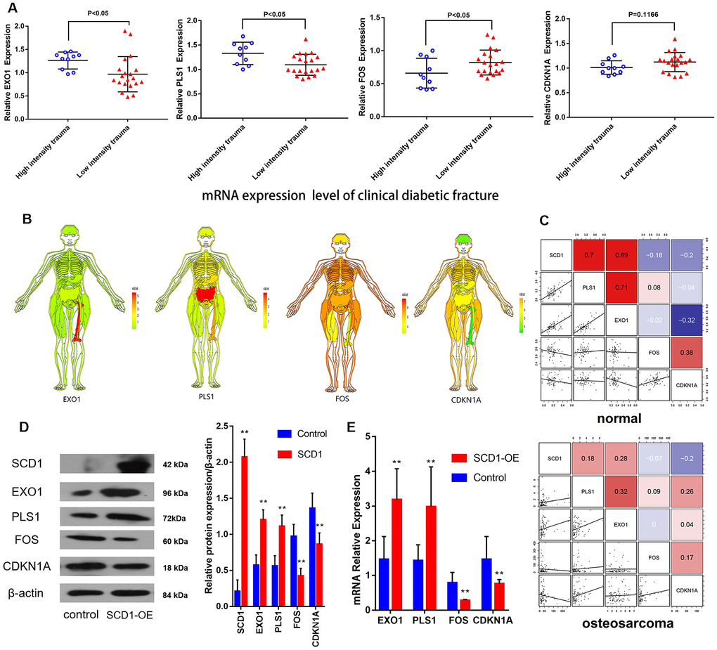Based on the above-reported findings, hsa-miR-203a and hsa-miR-1908 were selected as co–DE-miRNAs of GSE70318 and BM-MSCs after SCD1 overexpression. PLS1, EXO1, FOS, and CDKN1A were selected as co-DEMs of GSE25462 and BM-MSCs after SCD1 overexpression. Quantitative real-time PCR showed that the average expression levels of EXO1 and PLS1 were significantly lower in the bone marrow of diabetic patients with low-energy fracture than in that of controls, whereas the opposite was observed for FOS and CDKN1A (Figure 7A). To understand the expression of these genes in the human body more intuitively, we constructed human tissue–enriched protein expression maps. We found that SCD1, PLS1, and EXO1 are highly enriched in bone, whereas CDKN1A and FOS expression levels in bone are relatively low (Figure 7B, 7C). The expression of osteogenesis-promoting proteins may be higher and that of osteogenesis-free proteins may be lower in the normal bone environment; thus, SCD1, EXO1, and PLS1 may be more important for osteogenesis, whereas FOS and CDKN1A could be detrimental to skeletal development. Furthermore, gene microarray assays, western blotting and qPCR confirmed that SCD1 inhibits CDKN1A/FOS expression, and may upregulate EXO1/PLS1 (Figure 7D, 7E).