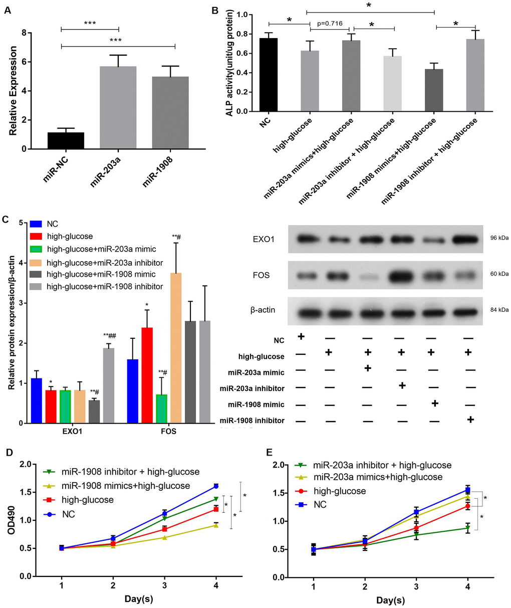 We next aimed to determine whether miR-1908 and miR-203a regulated the osteogenic differentiation of BM-MSCs. First, the expression of miR-203a and miR-1908 was greatly enhanced by infection with mimics (Figure 8A), and an ALP assay showed that the miR-1908 mimic reduced ALP activity, whereas the miR-203a mimic increased it (Figure 8B). Then, the protein expression of the BM-MSCs was analyzed by western blotting under the condition of infected with an miR-203a or miR-1908 mimic or transfected with an miR-203a or miR-1908 inhibitor respectively (Figure 8C). The miR-203a mimic significantly reduced the expression of FOS, and the miR-1908 mimic significantly decreased the expression of EXO1. The proliferation of BM-MSCs after miRNA overexpression or knockdown was then evaluated by MTT assay. The miR-1908 mimic significantly reduced proliferation at 2, 3, and 4 days, whereas the miR-203a mimic increased proliferation at the same timepoints (Figure 8D, 8E). These data indicate that miR-1908 reduces the proliferation and differentiation of BM-MSCs, whereas miR-203a increases them, in a hyperglycemic microenvironment.