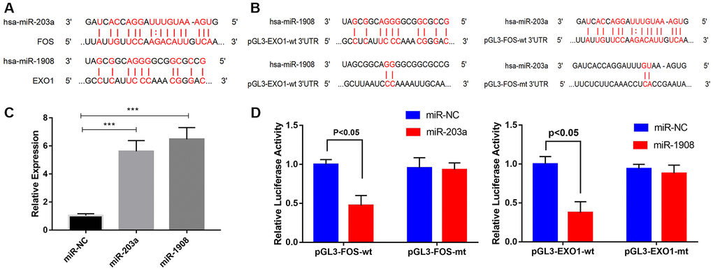 The MiRWalk and miRanda databases predict that EXO1 and FOS are regulated by hsa-miR-1908 and hsa-miR-203a, respectively (Figure 9A). We performed luciferase reporter assays to determine whether miR-203a regulated FOS expression and miR-1908 regulated EXO1 expression (Figure 9B). We confirmed the transfection efficiency of miR-1908 and miR-203a in UM-Chor1 cells (Figure 9C). UM-Chor1 cells co-transfected with pGL3-FOS-wt and miR-203a showed less luciferase activity than did those co-transfected with pGL3-FOS-mt and miR-negative control (NC; p < 0.05). Similarly, UM-Chor1 cells co-transfected with pGL3-EXO1-wt and miR-1908 showed less luciferase activity than did those co-transfected with pGL3-EXO1-mt and miR-NC (P < 0.05, Figure 9D). These results support the bioinformatics predictions and indicated that miR-1908 and miR-203a were direct regulators of EXO1 and PLS1 expression, respectively, in bone marrow.