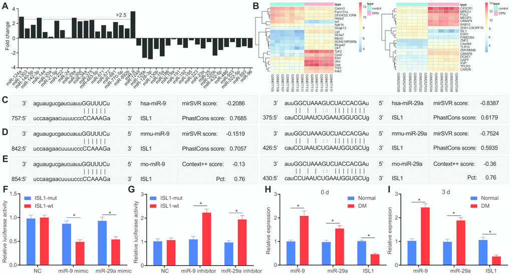 The miRanda website predicted that ISL1 was the target gene of miR-9 and miR-29a in human subjects (Figure 1C). Meanwhile, according to prediction results available on miRanda and TargetScan websites, ISL1 was revealed as a putative target gene of miR-9 and miR-29a both in mice and rats (Figure 1D, 1E). A dual luciferase reporter gene assay further validated that ISL1 was indeed the target gene of miR-9 and miR-29a. Compared with the negative control (NC) group, the miR-9 mimic and miR-29a mimic groups with transfection of ISL1-wild type (wt) plasmid presented with significantly decreased luciferase activity (p < 0.05), while there were no obvious changes in the luciferase activity of the both groups after transfection of ISL1-mutant (mut) (p > 0.05) (Figure 1F). Moreover, miR-9 inhibitor and miR-29a inhibitor resulted in significantly enhanced luciferase activity of ISL1-wt (p < 0.05), while there was no significant difference regarding the luciferase activity of ISL1-mut (p > 0.05) (Figure 1G). These results indicated that miR-29a and miR-9 specifically bound to ISL1.