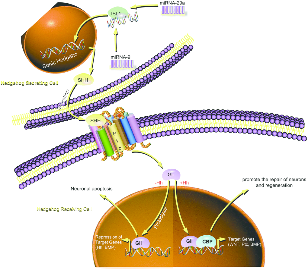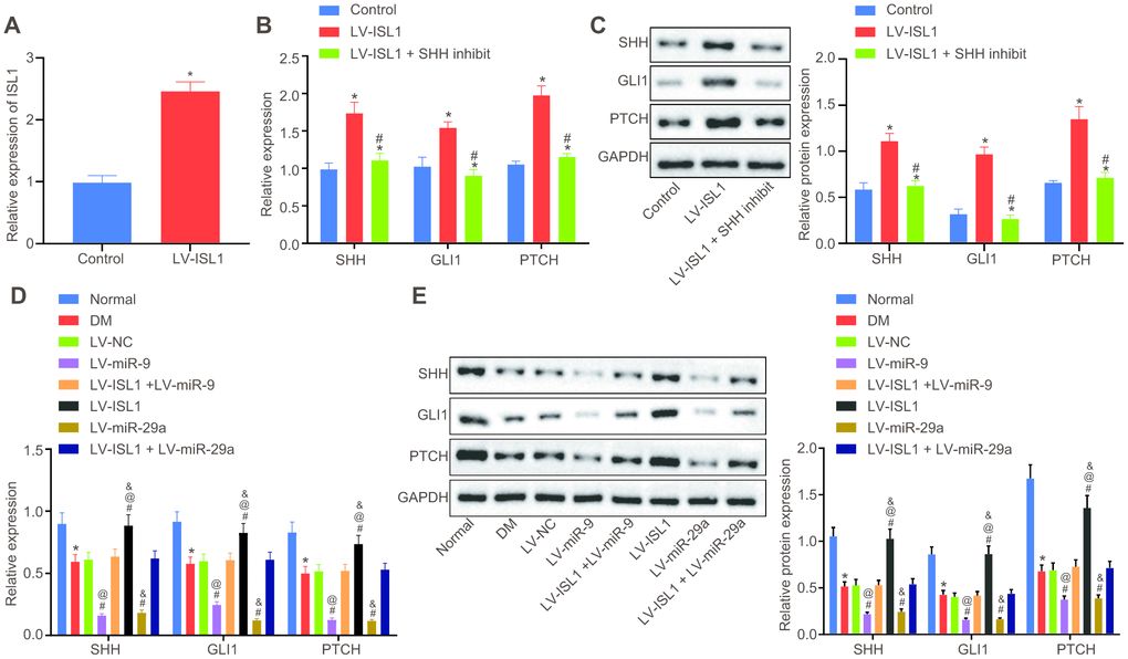 In conclusion, we found that miR-9 and miR-29a are highly expressed in DM, and inhibit the expression of ISL1 and the SHH signaling pathway, thereby promoting the occurrence and development of DPN, notably with respect to sciatic nerve pathology. Therefore, this study provides a key target for the treatment of DPN through the application of miR-9/miR-29a inhibitors. However, further studies are required to elucidate the specific mechanisms by which miR-9/miR-29a inhibitors alleviate DPN.