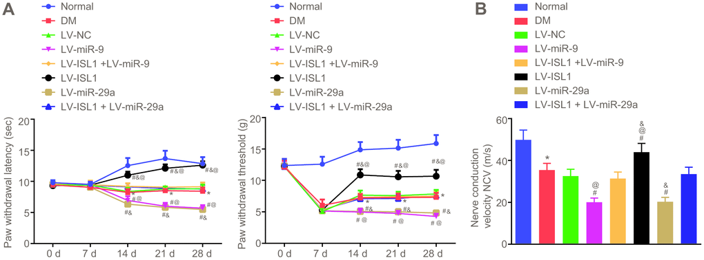 The nerve conduction velocity was measured after 4 weeks using the aforementioned methods, and the nociception threshold, represented by paw withdrawal latency and paw withdrawal threshold, was determined weekly in each group. After establishing the DM rat model, the rats showed significantly increased feed intake and urine volume, in addition to decreased exercise, spontaneous activity and reactions. After infection with lentivirus for rats, withdrawal thermal latency (WTL) and withdrawal mechanical threshold (WMT) were measured and recorded on a weekly basis. As shown in Figure 3A, rats in the DM group showed obviously decreased nociception threshold (p < 0.05). In comparison with the LV-NC and LV-ISL1 + LV-miR-9 groups, the LV-miR-9 group exhibited a notably decreased nociception threshold, while the LV-ISL1 group presented with increased nociception threshold (p < 0.05). miR-29a and miR-9 exhibited the same regulatory effect on the ISL1 gene. On the 28th day after model development, the nerve conduction velocity was measured in each group. As shown in Figure 3B, the LV-ISL1 group exhibited significantly improved nerve conduction velocity, while the LV-miR-9 and LV-miR-29a groups showed reduced nerve conduction velocity. The LV-ISL1 + LV-miR-9 and LV-ISL1 + LV-miR-29a groups exhibited higher nerve conduction velocity relative to the LV-miR-9 and LV-miR-29a groups, however, the velocity was slower relative to the LV-ISL1 group (p < 0.05). These findings suggested that the miR-9 and miR-29a decreased nerve conduction velocity and nociception threshold.
