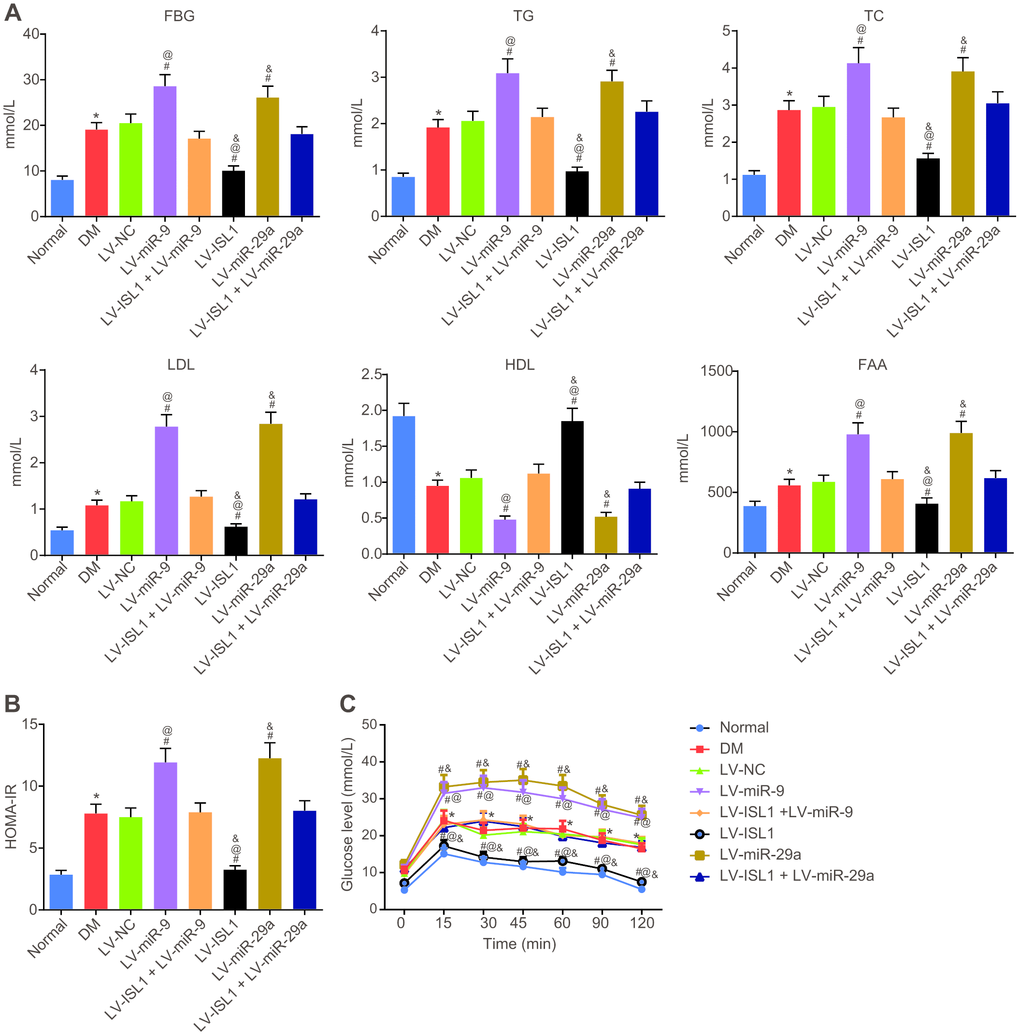 At 4 weeks after lentivirus infection in rats, rat serum was obtained in order to test blood glucose and lipid content. The result showed that rats with DM exhibited higher levels of fasting blood glucose (FBG), triglycerides (TG), total cholesterol (TC), low density lipoprotein (LDL), free fatty acids (FFA), and homeostasis model assessment of insulin resistance (HOMA-IR), yet lower high density lipoprotein (HDL) level than normal rats (p < 0.05). In comparison with the LV-NC and LV-ISL1 + LV-miR-9 groups, the LV-miR-9 group exhibited markedly increased levels of FBG, TG, TC, LDL, FFA and HOMA-IR, and notably decreased HDL; while the LV-ISL1 group exhibited significantly decreased levels of FBG, TG, TC, LDL, FFA and HOMA-IR, and increased HDL (p < 0.05). Thus, rats in the LV-ISL1 group showed improved biochemical indexes while the rats in the LV-miR-9 group exhibited aggravated DM (Figure 4A, 4B). miR-29a presented with the same results as miR-9.