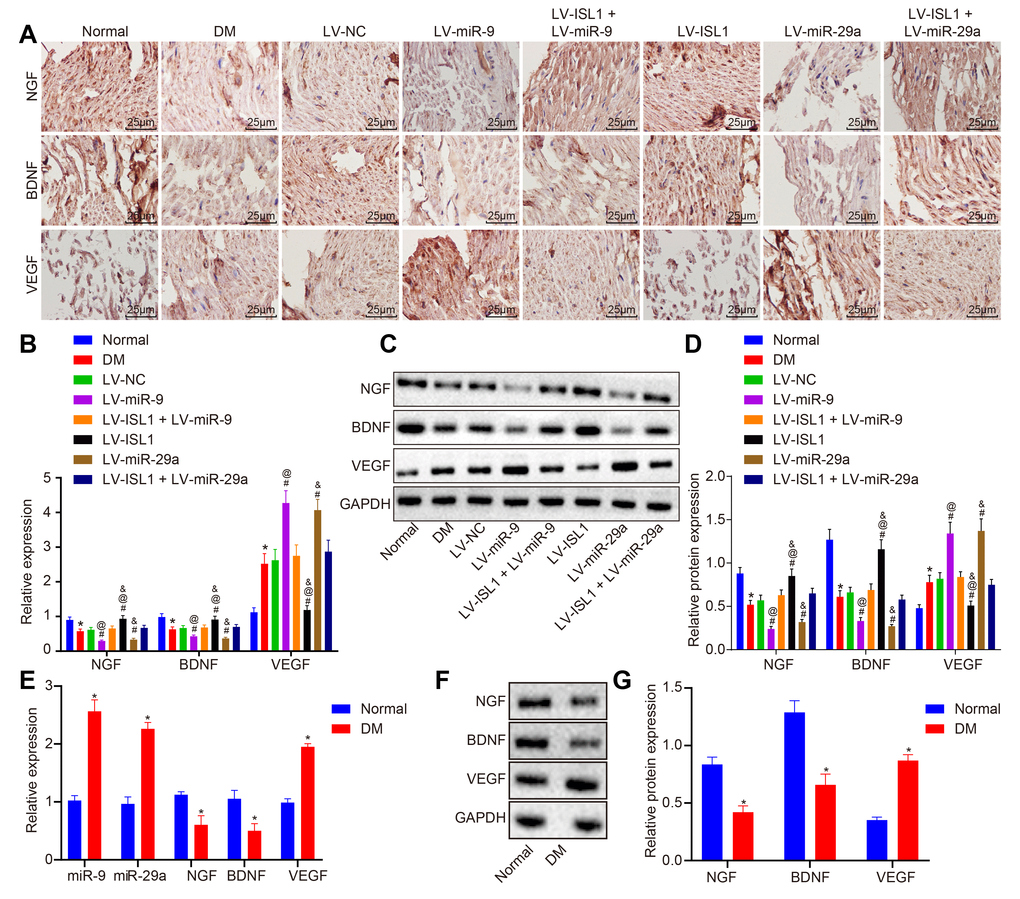 To further verify the expression of neurotrophic factors in the sciatic nerves, RT-qPCR and Western blot analysis were conducted to detect the expression of NGF, BDNF and VEGF. Compared with the normal rats, the rats with DM displayed significantly decreased levels of NGF and BDNF, yet increased VEGF level (p < 0.05). The LV-miR-9 and LV-miR-29a groups exhibited lower levels of NGF and BDNF, while higher VEGF level than the LV-NC group (p < 0.05). As opposed to the LV-NC, LV-ISL1 + LV-miR-9 and LV-ISL1 + LV-miR-29a groups, the LV-ISL1 group showed upregulated expression of NGF and BDNF, but downregulated VEGF level. In comparison to the LV-ISL1 + LV-miR-9 group, the LV-miR-9 group exhibited decreased expression of NGF and BDNF, along with increased VEGF expression. In comparison with the LV-ISL1 + LV-miR-29a group, the LV-ISL1 group exhibited upregulated expression of NGF and BDNF, as well as downregulated VEGF expression (p < 0.05) (Figure 6B–6D). Further investigation was carried out to detect whether there were differences regarding expression patterns of NGF, BDNF, VEGF, miR-9 and miR-29a between peripheral blood of patients with DM and healthy participants. Results revealed upregulated miR-9, miR-29a and VEGF, along with downregulated NGF and BDNF in peripheral blood of patients with DM than that of healthy participants (p < 0.05) (Figure 6E–6G), which was exactly in line with the rat results.