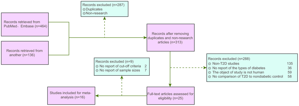 We retrieved PubMed and Embase databases to obtain literature relevant to this study. The literature search was limited to the English language and ended in September 2017. The search terms included a combination of key words and terms as follows: diabetes, microRNA, microRNA-9, microRNA-29a, diabetic peripheral neuropathy, ISL1 and Sonic Hedgehog signaling pathway. Two researchers independently carried out data extraction based on a predefined form. Additionally, any disputes appearing during data extraction were resolved through discussion with multiple researchers. The inclusion criteria of the study were as follows: (1) published literature about miR expression and DM; (2) study design: case-control studies; (3) study subjects: patients diagnosed as T2DM; (4) literature with similar study design and methods; (5) complete literature data or literature data supporting calculations concordant with the results of the present report. The exclusion criteria were as follows: (1) literature without data integrity (such as non-case-control studies); (2) duplicate publications or documents with poor quality, insufficient information and unclear description of specific data; (3) conference reports, systematic reviews and summary articles; (4) studies unrelated to DM; (5) non-English language studies; (6) non-human studies. A total of 600 studies adhering to the search strategies were retrieved, as shown in Figure 8. Finally, a total of 16 publications were included in this study. The studies included blood samples of 972 diabetic patients and 860 healthy control patients (Table 1). The fold change method was used to calculate the fold change value of miR for each included reference, where Log2 Fold change = Log2 (miR expression in DM) - Log2 (miR expression in NC). Fold change value > 0 indicated that the miR was highly expressed in DM; fold change value < 0 indicated that the miR was poorly expressed in DM.