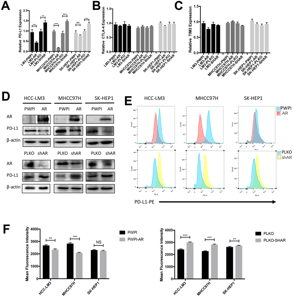 In an attempt to verify whether AR influenced immune checkpoint protein expression in HCC, we evaluated the impact of different AR expression levels on PD-L1 expression in various HCC cell lines. RT-qPCR showed that overexpression AR attenuated PD-L1 mRNA expression and knockdown AR increased PD-L1 mRNA expression in HCC cell lines (Figure 1A). No significant difference was observed in CTLA4 and TIM3 (Figure 1B, 1C). The analysis of western-blot consisted with RT-qPCR results (Figure 1D). Since PD-L1 is a transmembrane protein, PD-L1 membrane expression changes regulated by AR was determined by flow cytometry. We found the level of AR negatively correlated with the extent of membrane-localized PD-L1 (Figure 1E, 1F). Due to AR is a carcinogen in prostate cancer, next we tested the correlation in two prostate cancer cell line (DU145 and PC3) and no significant changes were observed (Supplementary Figure 1).