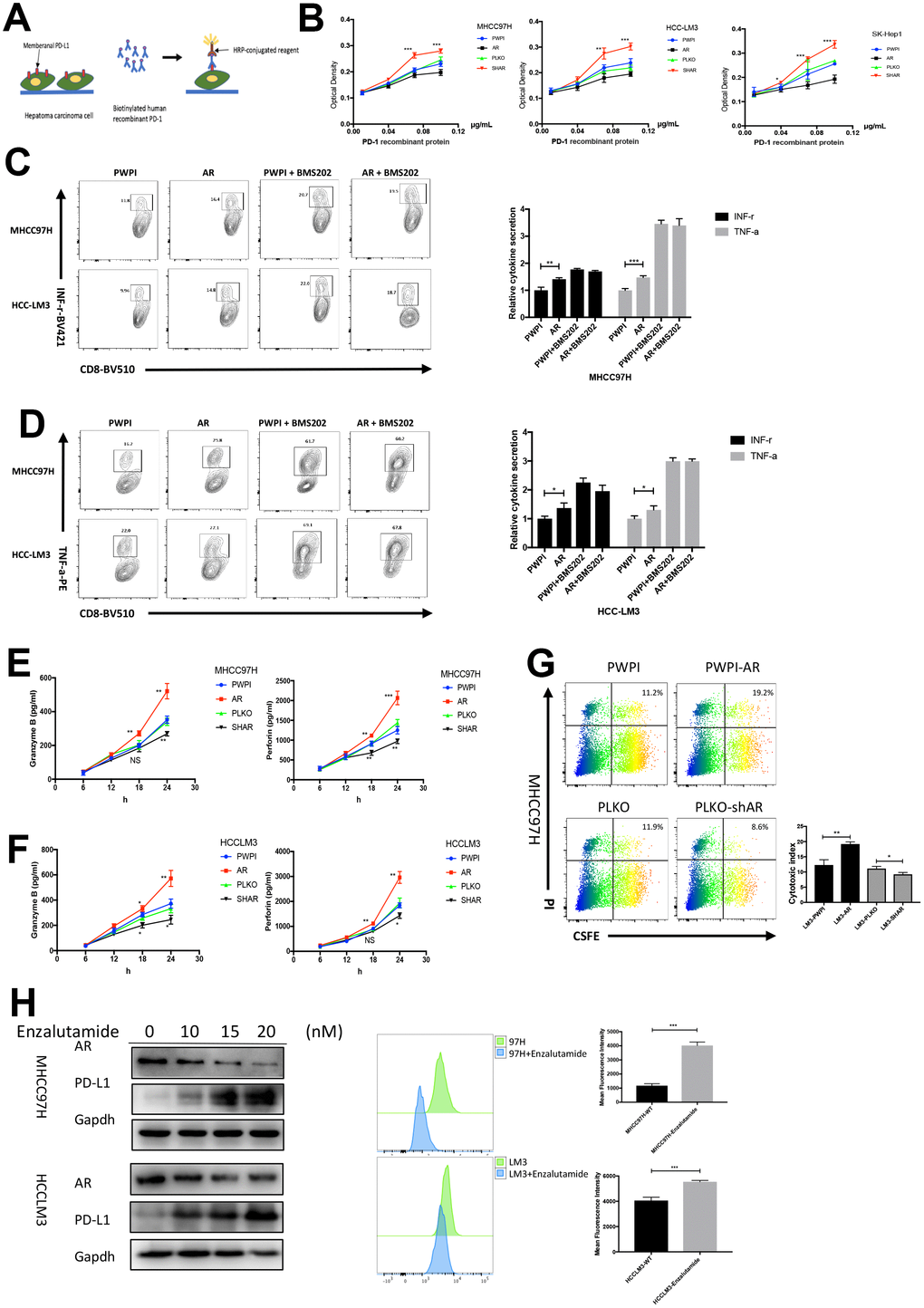 The cytotoxicity of T cells depends on the secretion of granular enzymes and perforin. Next, we tested the serum granzyme B and perforin using ELISA. The results showed that CD8+ T cell secreted more granzyme B and perforin when co-cultured with AR-overexpressed HCC cells, which are key factors for the development of cytotoxicity. On the other hand, AR-downregulated HCC cells attenuated the secretion of these factors by CD8+ T cells (Figure 2E, 2F). To further explore the impact of AR expression on CD8+ T cell-mediated cytotoxicity, a 24-h cytotoxicity assay was performed in MHCC97H cells. Flow cytometry showed that AR overexpression was associated with increased tumor cell death, while MHCC97H cells with low AR expression were more likely to resist to CD8+ T cells (Figure 2G). To demonstrate whether AR inhibitors cause changes in PD-L1, the second-generation AR antagonist, Enzalutamide, was used. As shown in Figure 2H, Enzalutamide attenuated AR expression and increased membrane PD-L1 expression.