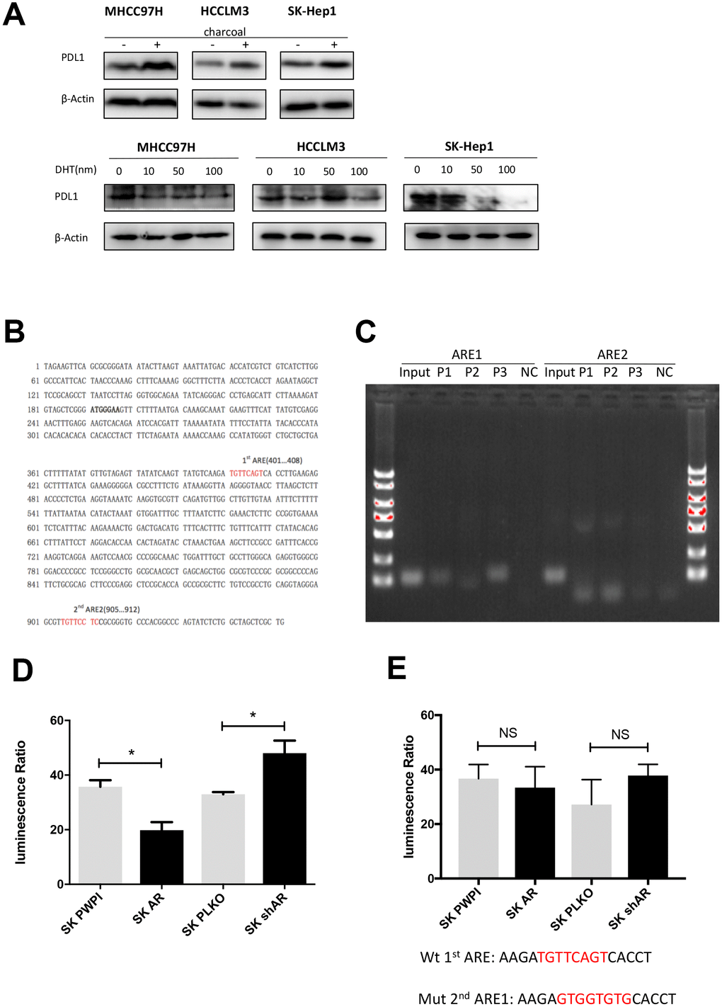 Interestingly, only half of the predicted canonical AREs were confirmed by ChIP analysis of the PD-L1 promoter. Normally, AR binds to ARE as a homo-dimer. However, one report demonstrated that AR bound to half-site-like sequences could still be transcriptionally functional [43], which may support our current findings.