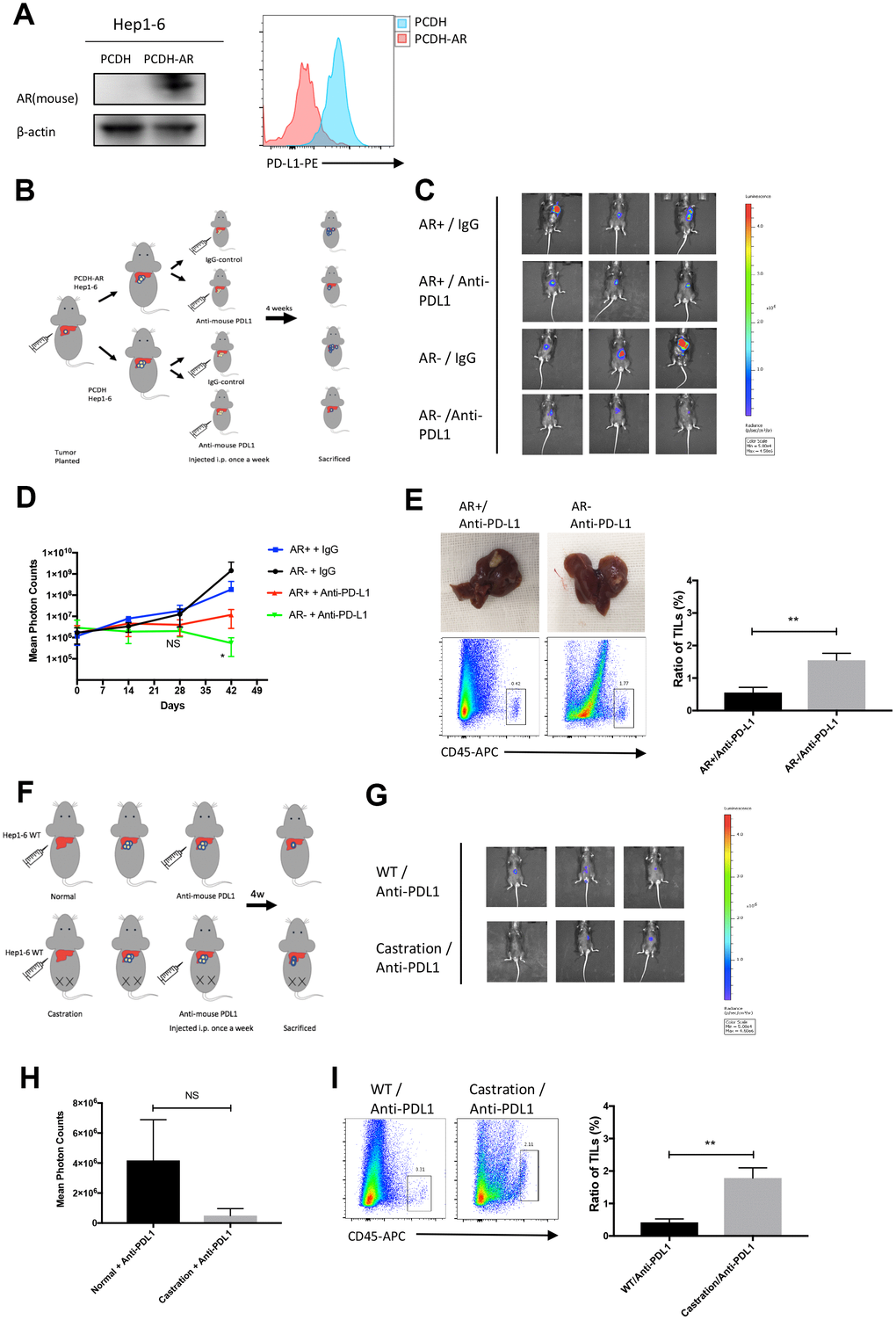 A total of 24 male 4-6 weeks old C57BL/6 mice were used. Hep 1-6-PCDH and Hep 1-6-AR cells were engineered to express the luciferase reporter gene (PCDNA3.0-luciferase) by stable transfection, and the positive clones were selected with G418 and expanded. Mice were randomly divided into 4 groups. Two groups mice were injected with Hep 1-6-PCDH cells and the two other groups were injected with Hep 1-6-AR cells with the quantity of 2 × 106 of luciferase expressing cells each mouse (as a mixture with Matrigel, 1:1) into the left lobe of the liver. Tumor formation and metastasis were monitored by fluorescent imager (IVIS Spectrum). As soon as liver tumors could be detected, we started to inject the PD-L1 inhibitor (Bioxcell EB0101) intraperitoneally (i.p.) to one group of Hep 1-6-PCDH injected mice and one group of Hep 1-6-PCDH injected mice, at the dosage of 4 mg/kg, once a week. The remaining groups were injected with the IgG control (Bioxcell BE0086) at the same dosage, once a week. Mice were sacrificed after 6 weeks of injection and liver tumors were isolated for further examination.