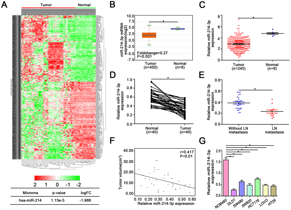 According to the data from ONCOMIR [21] (Supplementary Figure 1), there are 10 cancer types, including colon cancer, in which tumorigenesis is significantly associated with the expression of miR-214-3p. We also found that miR-214-3p was significantly downregulated in colon cancer. Similarly, data from the TCGA, Starbase v3.0 [22] and GEO databases (GSE30454) also support this result (Figure 1A–1C). Then, qRT-PCR was used to analyze the expression of miR-214-3p in 40 paired CRC tissues and their controls (Figure 1D). Confirming the above database data, we found that the expression of miR-214-3p was lower in CRC tissues than in adjacent normal tissues. Remarkably, our results showed that the expression level of miR-214-3p was negatively correlated with lymph node metastasis and tumor size (Figure 1E–1F, Table 1). Thus, CRC tissues associated with lymph node metastasis and large tumor size contained lower expression of miR-214-3p. In addition, we compared the expression level of miR-214-3p between different cell lines (Figure 1G). The results also showed a significantly lower expression of miR-214-3p in CRC cells (DLD1, SW480, SW620, HCT116 and HT29) than in normal colonic epithelial cells (NCM460).