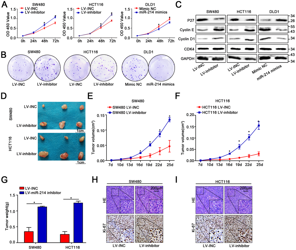 The three colon cancer cell lines SW480, HCT116 and DLD1 were utilized to conduct the following experiments due to the previous results showing that miR-214-3p expression was lower in SW480 and HCT116 cells than in other colon cancer cell lines and higher in DLD1 cells than in other colon cancer cell lines. Therefore, a lentivirus-based system (LV-miR-214-3p inhibitor and LV-INC) was used to establish stable miR-214-3p knockdown SW480 and HCT116 cell lines. The efficiency of transfection was detected by qRT-PCR (Supplementary Figure 2A). CCK8, EDU and colony formation assays were applied (Figure 2A–2B, Supplementary Figure 2B–2E), and the results indicated that the proliferation ability was enhanced in SW480 and HCT116 cells when the expression of miR-214-3p was suppressed. The WB results also showed that the expression levels of the proliferation-related genes cyclin D1, cyclin E and CDK4 were increased, while the level of P27 was decreased when miR-214-3p was suppressed (Figure 2C, Supplementary Figure 2F). Additionally, the experiments above were repeated when miR-214-3p was overexpressed in DLD1 cells by transfection with the miR-214-3p mimic (Figure 2A–2C, Supplementary Figure 2A–2B, 2G); the results also contributed to the conclusion that miR-214-3p participated in suppressing proliferation in CRC cells. As expected, miR-214-3p knockdown significantly promoted the growth of subcutaneous xenograft tumors in vivo (Figure 2D–2G). The following IHC results indicated that the Ki-67 (a proliferation marker) index was increased remarkably when miR-214-3p was knocked down (Figure 2H–2I).