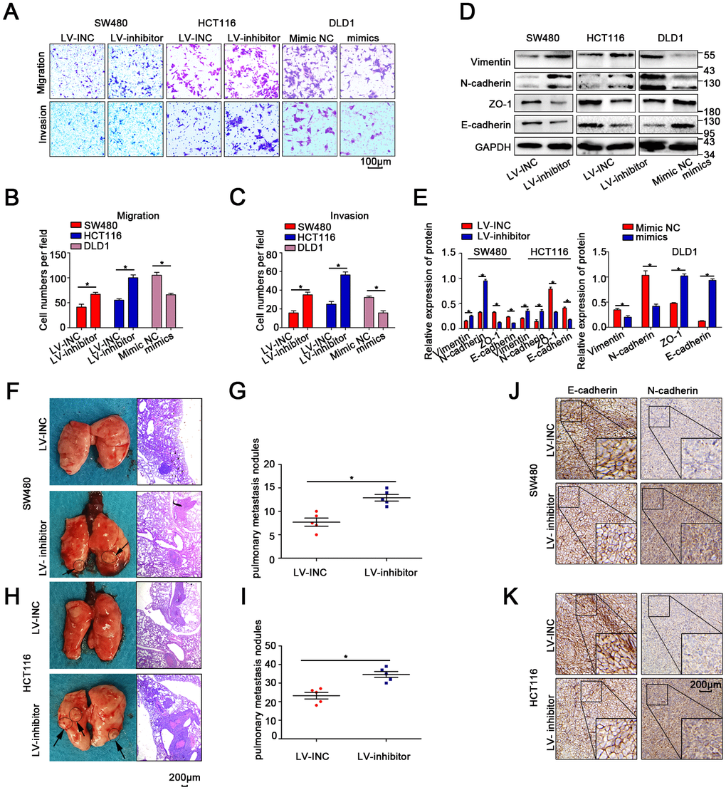Transwell and wound-healing assays indicated that migration was enhanced when miR-214-3p expression was suppressed in SW480 and HCT116 cells (Figure 3A–3C, Supplementary Figure 3A–3B). Moreover, WB, qRT-PCR and IF demonstrated that the suppression of miR-214-3p could significantly increase the levels of E-cadherin and Zo1, as well as inhibit the expression of N-cadherin and vimentin (Figure 3D–3E, Supplementary Figure 3C–3D). Additionally, the results in DLD1 cells when miR-214-3p was overexpressed via miR-214-3p mimic also supported the conclusion that miR-214-3p overexpression significantly suppressed cell migration (Figure 3A–3E, Supplementary Figure 3C). To explore the effect of miR-214-3p on metastasis activity in vivo, SW480 and HCT116 cells transfected with the LV-miR-214-3p inhibitor or LV-INC were injected into the tail vein of immunodeficient mice (Figure 3F–3I). The results showed that more pulmonary metastasis nodules could be observed in mice injected with the LV-miR-214-3p inhibitor. Furthermore, we measured the expression of EMT-association proteins in the subcutaneous xenograft tumors by IHC analysis (Figure 3J–3K), and the results showed that the expression of epithelial markers (e.g., E-cadherin) was significantly decreased and that the expression of mesenchymal markers (e.g., N-cadherin) was significantly inhibited when miR-214-3p was knocked down. In summary, the data above support the conclusion that miR-214-3p suppressed CRC cell proliferation and migration in vitro and in vivo.