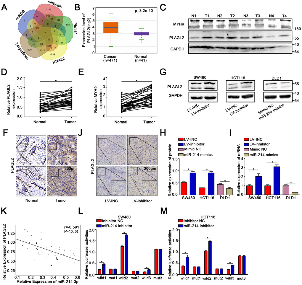 To further explore the downstream genes of miR-214-3p, five public bioinformatics algorithms, TargetScan [23], miRDB [24] (the top fifty predicted genes were chosen), miRwalk [25], miR22 [26] and Pictar [27], were utilized. We found seven candidate target genes of miR-214-3p (Figure 4A). MicroRNAs play an inhibitory role in the regulation of direct target genes. GEPIA (http://gepia.cancer-pku.cn/) was applied to compare the expression levels of the seven candidate genes in CRC tissues and adjacent normal tissues (Figure 4B, Supplementary Figure 4A–4F). The results showed that PLAGL2 expression was obviously high in CRC tissues, indicating that PLAGL2 is likely directly regulated by miR-214-3p. The expression level of PLAGL2 in the CRC tissues we collected was also measured (Figure 4C–4D, Figure 4F); as expected, the level of PLAGL2 was obviously higher in the cancer tissues than in the normal tissues. Next, we found that the mRNA and protein levels of PLAGL2 in SW480 and HCT116 cells were significantly increased when miR-214-3p was suppressed. The opposite results were observed when miR-214-3p was overexpressed in DLD1 cells (Figure 4G–4J, Supplementary Figure 4G–4H). Next, we analyzed the correlation between the expression levels of miR-214-3p and PLAGL2 (Figure 4K). The results indicated that the expression level of PLAGL2 was frequently higher in samples with low miR-214-3p expression. Finally, dual-luciferase reporter assays were conducted (Figure 4L–4M, Supplementary Figure 4I). The relative luciferase activity of the PLAGL2 WT pmirGlo-3’-UTR vector was markedly increased when miR-214-3p was decreased in SW480 and HCT116 cells, whereas miR-214-3p was incapable of altering the luciferase activity of the PLAGL2-Mut pmirGlo-3’-UTR vector, indicating that miR-214-3p likely regulates the expression of PLAGL2 through direct binding to the 3’-UTR. Considering all the data above, we concluded that PLAGL2 is a direct downstream gene of miR-214-3p.