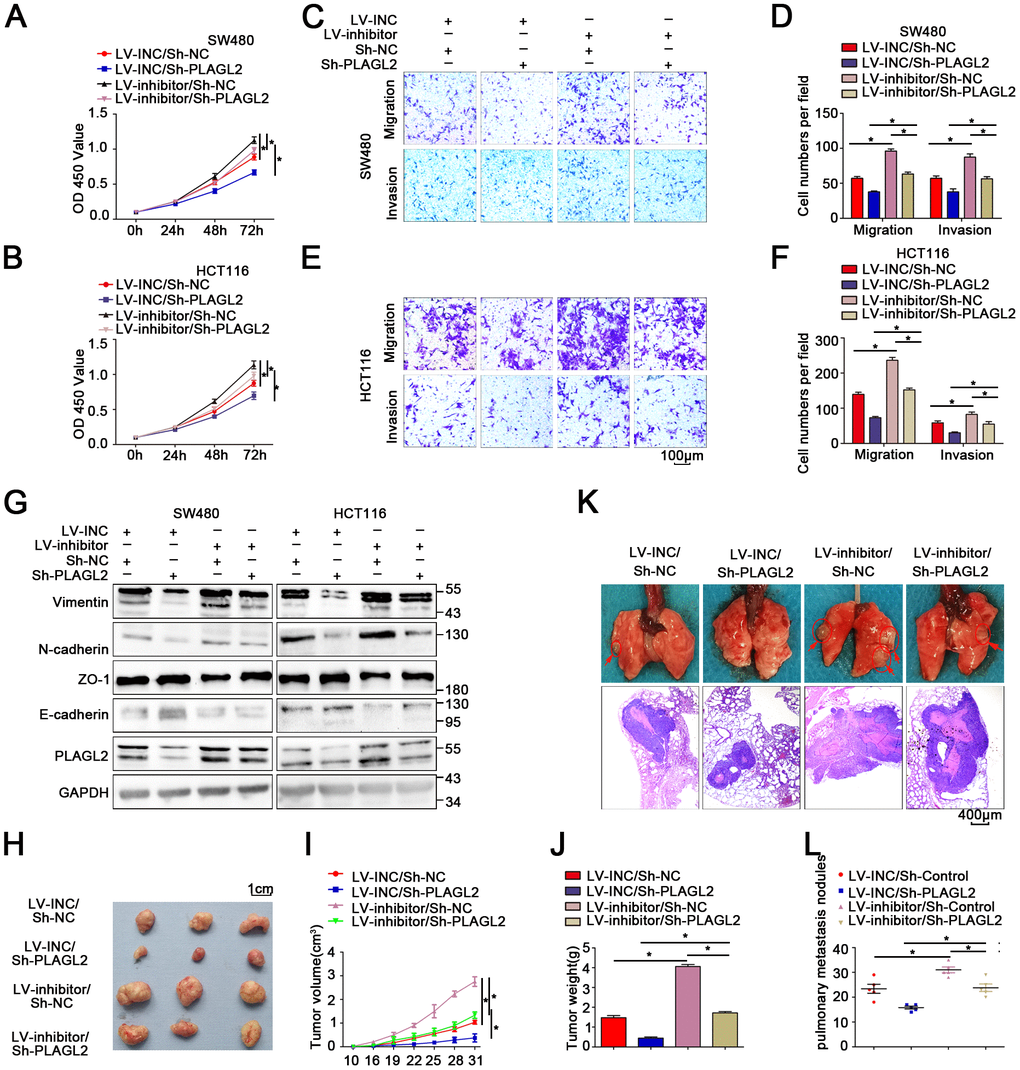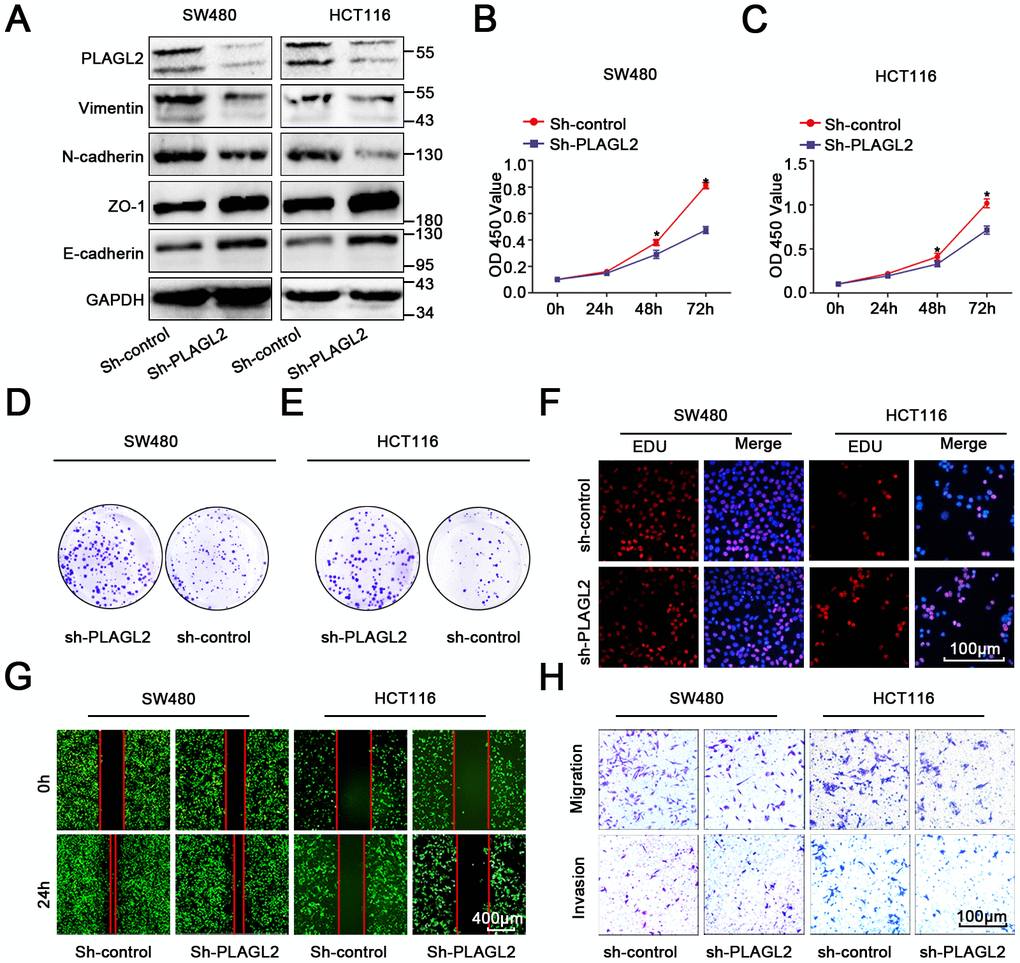 To further explore the function of PLAGL2 in colon cancer cells, we first transfected sh-PLAGL2 into SW480 and HCT116 cells to establish stable knockdown cell lines with the lentiviral vector. Then, we utilized WB and qRT-PCR assays to detect the efficiency of transfection (Figure 5A, Supplementary Figure 5A–5D). Next, we evaluated the EMT process when PLAGL2 was knocked down (Figure 5A, Supplementary Figure 5A–5D). We found that silencing PLAGL2 obviously inhibited the expression of epithelial markers and enhanced the expression of mesenchymal markers. Subsequently, we conducted CCK8, EDU and colony formation assays to evaluate the function of PLAGL2 in the proliferation of CRC cells (Figure 5B–5F, Supplementary Figure 5E–5F). Finally, transwell and wound-healing assays were conducted to investigate the function of PLAGL2 in the migration of CRC cells (Figure 5G–5H, Supplementary Figure 5G–5H). The results indicated that the knockdown of PLAGL2 could obviously decrease the growth ability and metastasis of CRC cells.