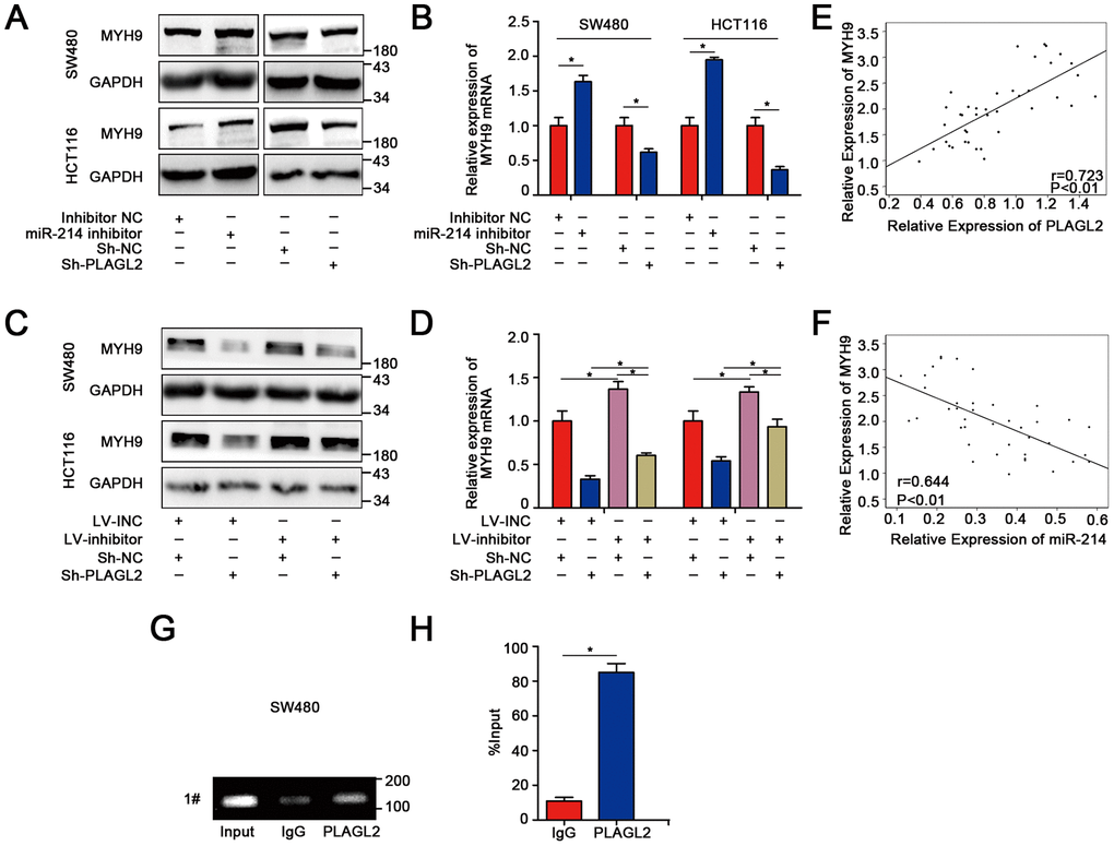 Previous studies have shown that PLAGL2 could regulate the actin cytoskeletal architecture. MYH9, a well-known cytoskeleton molecule, is closely related to the proliferation and metastasis of human CRC. Therefore, we attempted to explore the relationship between PLAGL2 and MYH9. Interestingly, we found that silencing PLAGL2 obviously decreased the expression of MYH9 at both the protein and mRNA levels. MYH9 could also be regulated by miR-214-3p (Figure 7A–7B). Furthermore, knockdown of PLAGL2 significantly reversed the suppression effect of the miR-214-3p inhibitor on the expression of MYH9 (Figure 7C–7D, Supplementary Figure 7B). Next, we investigated the expression level of MYH9 in CRC tissues and found that MYH9 was significantly higher in the cancer tissues than in the adjacent normal tissues (Figure 4C, 4E and Supplementary Figure 7A), which was consistent with previous results. The data also indicated that there was an obvious correlation between the expression levels of PLAGL2 and MYH9 (Figure 7E). Moreover, a significant correlation between the expression levels of miR-214-3p and MYH9 was also observed (Figure 7F). Finally, ChIP assays were performed in SW480 cells (Figure 7G–7H). Compared to the sample bound to IgG, the PLAGL2-bound complex showed a remarkable enrichment of the MYH9 promoter. Considering the data above, we propose that the expression of MYH9 was regulated by miR-214-3p and PLAGL2 and that MYH9 was a direct downstream gene of PLAGL2.