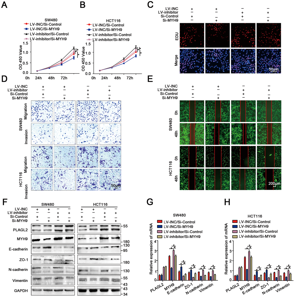 To explore the biological function of MYH9 in miR-214-3p/PLAGL2-regulated colon cancer progression, si-MYH9 was co-transfected with the Lv-miR-214-3p inhibitor into SW480 and HCT116 cells. According to the results of CCK8 and EDU assays (Figure 8A–8C, Supplementary Figure 8A), MYH9 silencing could reverse the effects of miR-214-3p inhibition on CRC cell proliferation. We next utilized transwell and wound-healing assays to analyze the metastasis ability when si-MYH9 and Lv-miR-214-3p inhibitors were co-transfected (Figure 8D–8E, Supplementary Figure 8B–8E). The results showed that the CRC cells co-transfected with Lv-miR-214-3p inhibitor+si-MYH9 showed weaker migration ability than cells co-transfected with Lv-miR-214-3p inhibitor+si-NC. What’s more, the EMT process caused by the miR inhibitor was also reversed when MYH9 was silenced (Figure 8F–8H).