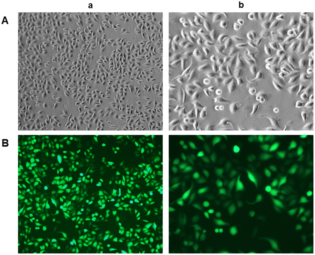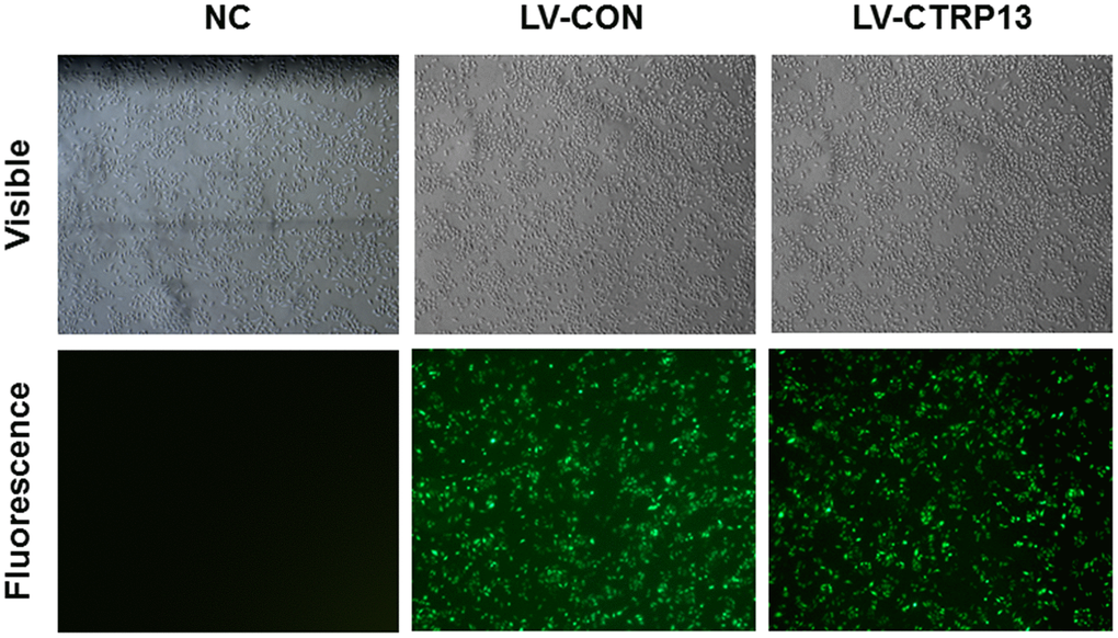 The rLSECs in a 10 cm dish at 80% confluency were transfected with lentiviral vectors overexpressing CTRP13 (LV-CTRP13) and their negative control (LV-CON). To achieve optimal gene, Enhanced Infection Solution (ENi.s.) in the presence of 50 μg/mL polybrene was used according to the manufacturer’s instructions. At 96 hours after infection, cell phenotype and characteristics were observed under an inverted fluorescence microscope. The infection efficiency was evaluated by real-time quantitative polymerase chain reaction (qRT-PCR) and Western blot analysis.