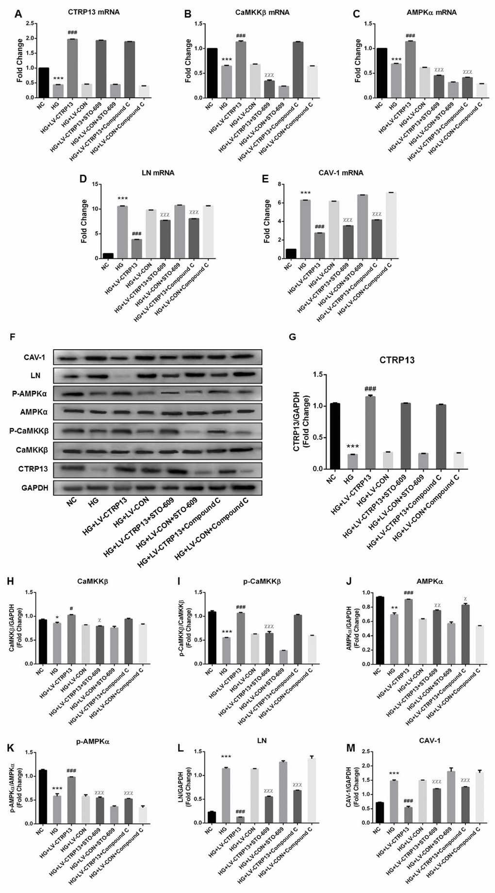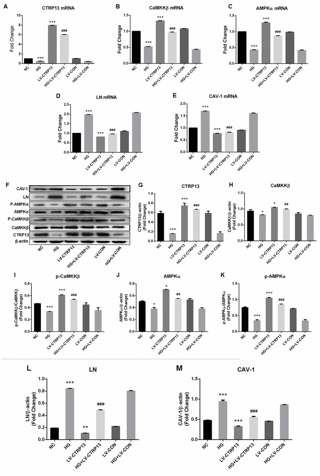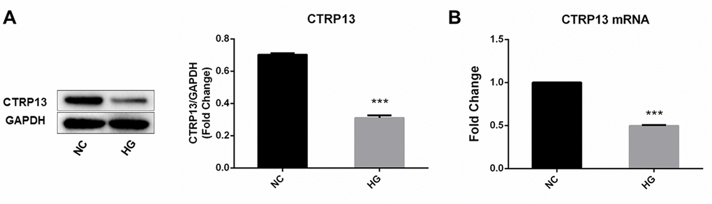 The effect of high glucose on rLSECs has been reported in our previous research [22]. To investigate the effect of high glucose on CTRP13, CaMKKβ, AMPK, LN and CAV-1 expression in rLSECs, we measured the expression level of CTRP13, CaMKKβ, AMPK, LN and CAV-1 using qRT-PCR and Western blot analyses. Firstly, the CTRP13 expression levels were examined in response to high glucose. Real-time qPCR and Western blot analyses revealed that incubation with 25 mM high glucose (HG) for 24 hours resulted in a decrease of CTRP13 expression in rLSECs (Figure 2). Besides, results showed that high glucose resulted in a decrease of p-CaMKKβ and p-AMPK expression and an increase of LN and CAV-1 expression in rLSECs (Figure 3B–3F and 3H–3M). Hence, our results substantiate that high glucose reduces CTRP13, p-CaMKKβ and p-AMPK expression and increases LN and CAV-1 formation in rLSECs.
