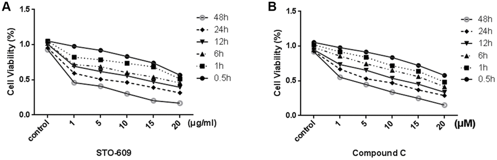 In order to test the effective treatment concentrations of STO-609 and Compound C, cells are respectively treated with 0, 1, 5, 10,15 or 20 mg/ml STO-609 and 0, 1, 5, 10,15 or 20 μM Compound C for 0.5, 1, 6, 12, 24 or 48 h and then assessed using the MTT assay. We observed that the cells viability decreased in a dose- and time-dependent manner (p < 0.05; Figure 5). The concentrations of STO-609 >10 mg/ml and Compound C >10 μM had noticeable cytotoxic and inhibitory effects. Furthermore, exposure to 20 mg/ml STO-609 and 20 μM Compound C for 48 h decreased significantly the viability of rLSECs (by 76% and 76.8% total from control, respectively). Therefore, we selected the 10 mg/ml STO-609 (55.1%) and 10 μM compound C (54.2%) for 24h to be used in the following study carried out in rLSECs, respectively.