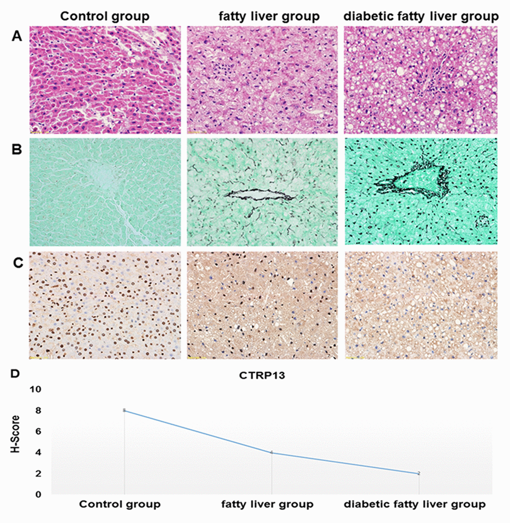 In immunohistochemistry staining, the positive areas are dyed in blue. The positive areas of CTRP13 were shown a significantly decreasing trend in the liver from the control rats to fatty liver rats and diabetic fatty liver rats (Figure 7C and 7D), which clearly indicated that the expression of CTRP13 was reduced in the liver from diabetic fatty liver rats.