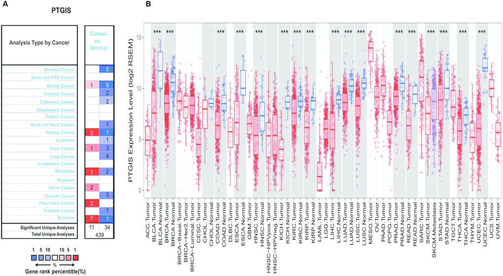 PTGIS expression levels in different tumors were analyzed via the Oncomine database (https://www.oncomine.org) [46, 47]. The threshold settings were as follows: gene ranking of top 10%, fold change of 2.0, and P-value of 1E-4.