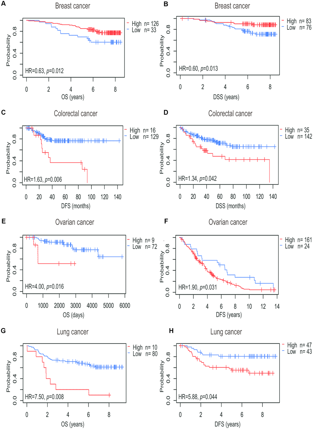 To explore the correlation between PTGIS expression and prognosis in human cancers, we investigated the effects of PTGIS expression on survival via PrognoScan. Eight out of thirteen cancers showed a potential correlation between PTGIS and prognosis (Supplementary Table 2). Interestingly, compared with low PTGIS expression, high expression of PTGIS indicated a better survival prognosis for overall survival (OS) (hazard ratio [HR]=0.63, 95% confidence interval [CI]=0.44 to 0.90, P=0.012) and disease specific survival (DSS) (HR=0.60, 95% CI=0.40 to 0.90, P=0.013) in breast cancer (Figure 2A and 2B). However, among the other three common solid tumors (colorectal cancer, ovarian cancer, and lung cancer), high PTGIS expression was associated with a worse prognosis than low PTGIS expression (Figure 2C–2H). In addition, PTGIS had no significant effect on OS in colorectal cancer. The survival plots generated from different datasets are shown in Supplementary Figure 2.