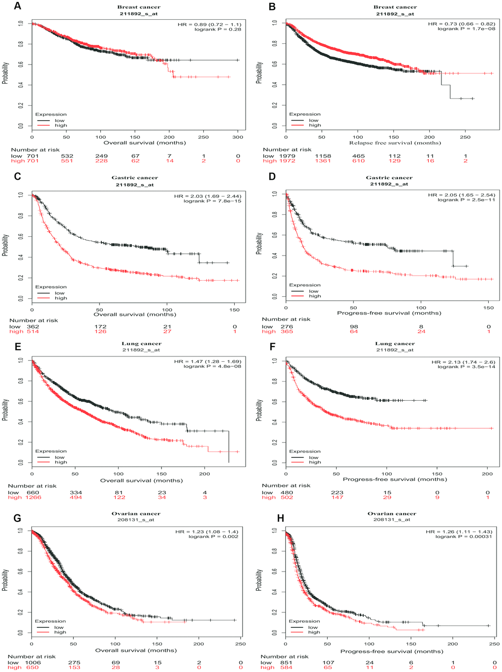 Then, we further assessed the prognostic value of PTGIS in tumors with the Kaplan-Meier plotter, which is based on Affymetrix microarray data. Notably, PTGIS had less influence on OS in this analysis than it had been shown to have in the PrognoScan analysis for breast cancer (HR=0.89, 95% CI=0.72 to 1.1, P=0.28) (Figure 3A), and high PTGIS expression was correlated with poor prognosis in gastric cancer (OS HR=2.03, 95% CI=1.69 to 2.44, P=7.8e-15; progression-free survival [PFS] HR=2.05, 95% CI=1.65 to 2.54, P=2.5e-11) (Figure 3C and 3D). Consistent with previous results, patients with high expression of PTGIS had a poor prognosis in both lung cancer (OS HR=1.47, 95% CI=1.28 to 1.69, P=4.8e-08; PFS HR=2.13, 95% CI=1.74 to 2.6, P=3.5e-14) and ovarian cancer (OS HR=1.23, 95% CI=1.08 to 1.4, P=0.002; PFS HR=1.26, 95% CI=1.11 to 1.43, P=3.1e-4) (Figure 3E–3H). Based on this large-sample validation analysis, these results suggest that high PTGIS expression implies reduced survival in ovarian, lung and gastric cancer.