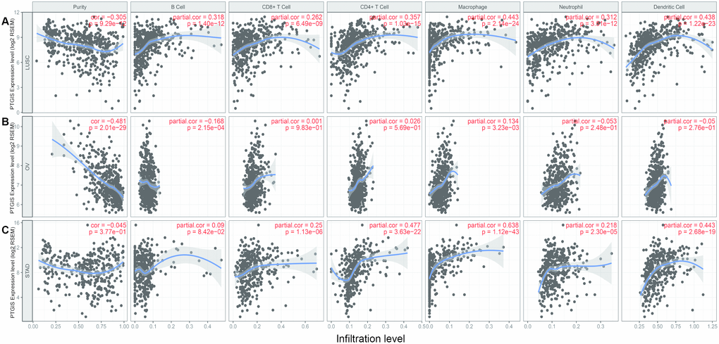 To explore the effects of PTGIS expression on tumor-infiltrating immune cells, we analyzed the relationships between PTGIS expression and various markers of immune cells in LUSC, OV, and STAD via public databases. We selected some of the infiltrating immune cells, including innate immune cells (Supplementary Table 5) and adaptive immune cells (Supplementary Table 6), and analyzed the relationship between PTGIS and specific markers of these immune cells in LUSC, OV and STAD (Figure 5). In LUSC and STAD, the changes in correlation coefficients between the expression level of PTGIS and the expression of gene marker sets of different immune cells were not significant after adjustment for purity. However, the association between PTGIS and immune markers changed dramatically in OV. It is worth noting that the correlation between PTGIS and various immune cell markers was significantly increased without adjustment for purity.