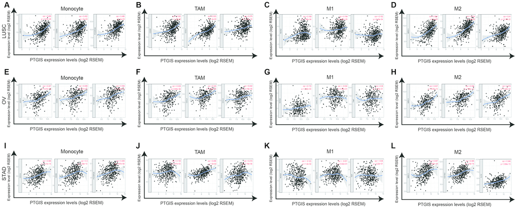 Specifically, we found that PTGIS expression was more highly correlated with gene markers of monocytes/macrophages (monocytes, TAMs, and M2 macrophages) than with gene markers of other infiltrating immune cells in LUSC, OV and STAD (Supplementary Table 5). In addition, we determined the correlation coefficients between PTGIS and specific markers of monocytes, TAMs, M1 macrophages, and M2 macrophages in LUSC, OV and STAD (Figure 5). We further investigated the relationship between PTGIS and the above gene markers of immune cells in normal tissues and tumors using the GEPIA database. Notably, there was no correlation between PTGIS and most immune markers of monocytes and TAMs in normal lung tissues. The results of the correlation were generally consistent with those of the TIMER analysis in tumors (Supplementary Table 7). These results imply that PTGIS likely plays a promoting role in the regulation of macrophage polarization in LUSC, OV, and STAD.