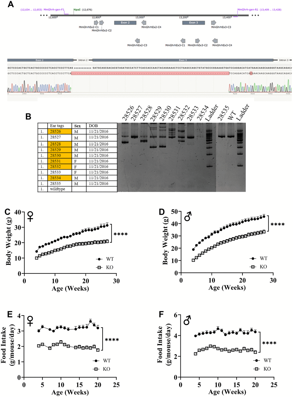 Utilizing CRISPR/Cas9-mediated gene-editing method, we generated homozygous GHRH-/- mice (Figure 1A). In a litter of 10 G0 pups, 8 carried indels and large deletions in the GHRH locus. Our targeted allele (#28528) is a 291 base pairs deletion that eliminates the splice donor site at exon 2, intron 2-3 and a large part of Exon 3 (77 base pairs out of 102 base pairs); this allele was selected based on, successful germline transmission (Figure 1A, 1B). Predicted translation of the resulting sequence suggests an in-frame mutation leading to a loss of 26 amino acids, including 21 amino acids required for full activity (RMQRHVDAIFTTNYRKLLSQLYARKV). The line was used in all subsequent studies. We measured body weight and food consumption of GHRH-/- and WT littermates longitudinally. Male and female GHRH-/- mice were significantly lighter than their littermate controls (Figure 1C, 1D). In addition, GHRH-/- mice consumed dramatically fewer calories than WT littermates (Figure 1E, 1F).