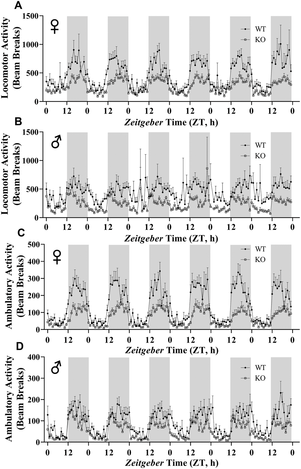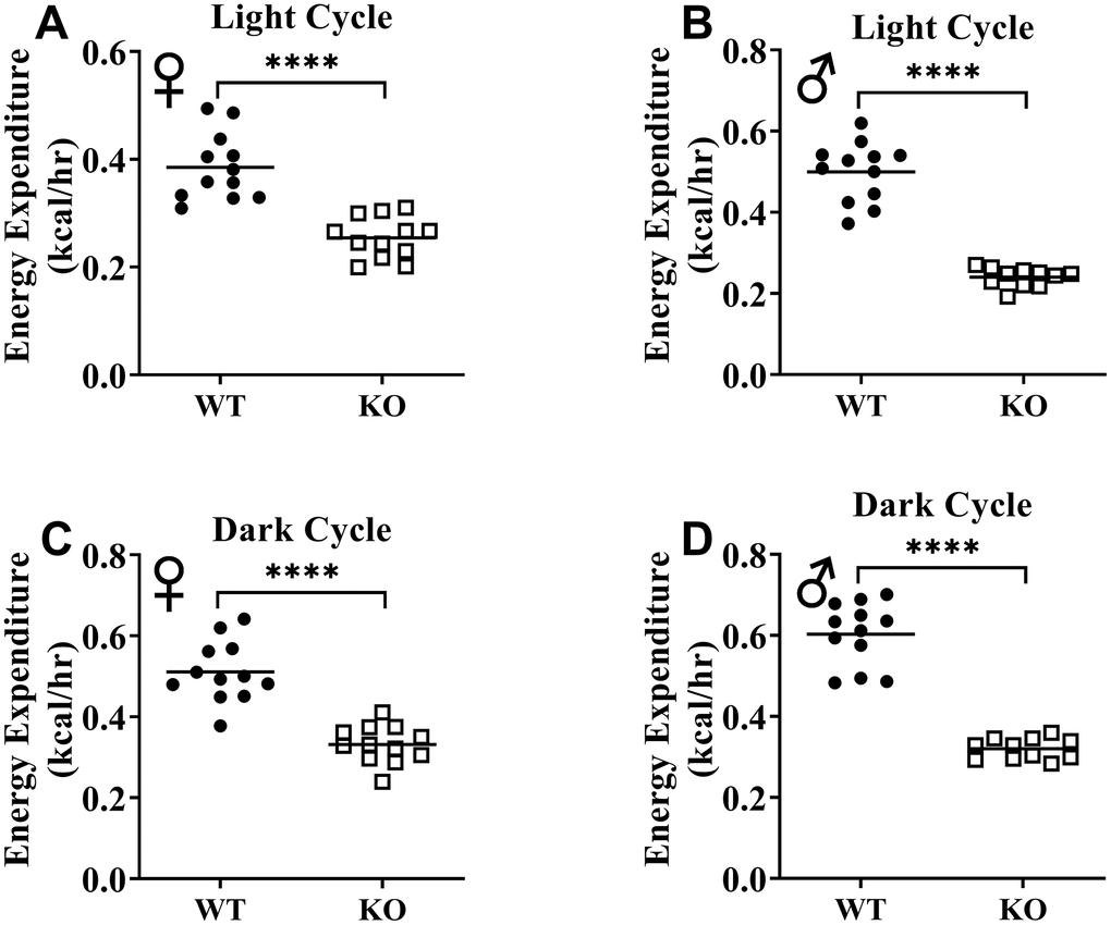 We calculated energy expenditure from the respiratory parameters collected by indirect calorimetry to assess the effect of GH-deficiency on metabolic rate. Figure 9A, 9B show energy expenditure of female and male GHRH-/- mice compared with WT littermates over 6 days. We averaged this data into a single day (Figure 9C, 9D). The analyses of energy expenditure representing the 6 light and the 6 dark cycles confirmed the dramatic downward shift of metabolic rate in GH-deficient mice (Figure 10A–10D). Controlling for the effect of significant differences in body weight, ANVOCA method, showed significant reduction in metabolic rates of both male and female GHRH-/- mice compared to WT littermates in light and dark cycles (Figure 9E, 9H). We further measured voluntary physical activity of mice during our indirect calorimetry study. Overall pattern indicates both male and female GHRH-/- mice have reduced activity compared to WT littermates during light and dark cycles (Figure 11A–11D).