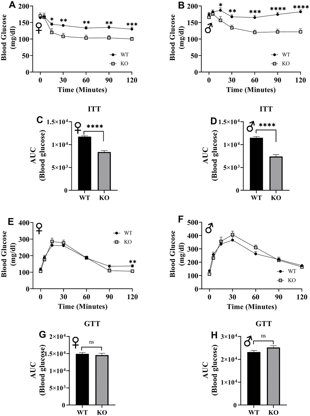 To assess insulin tolerance, we performed intraperitoneal insulin injections and measured blood glucose levels. Upon injection with insulin, glucose concentrations significantly decreased in GHRH-/- female and male mice compared to their littermate controls (Figure 12A, 12B). Area under the curve (AUC) data were significantly lower GHRH-/- female and male mice than their littermate controls (Figure 12C, 12D). To evaluate the glucose homeostasis in vivo, we performed intraperitoneal glucose tolerance test (IPGTT) with mice fasted overnight. We did not observe any significant differences in blood glucose levels throughout the 2-hour period following glucose injection (Figure 12E, 12F). AUC analyses did not reveal any statistical significance due to loss of GHRH (Figure 12G, 12H). This data strongly supports the notion that GH deficiency improves insulin sensitivity, but not glucose homeostasis in vivo.