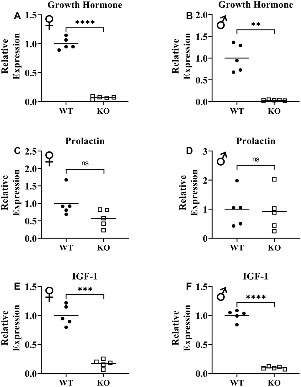 Previously, knockout of GHRH gene was shown to result in significant reduction of GH expression in pituitary and IGF-1 expression in liver [17]. To assess loss of function of GHRH, we measured mRNA levels of GH in pituitary and IGF-1 in liver. We observed that expression of both GH and IGF-1 genes were significantly decreased in GHRH-/- mice compared to WT littermates (Figure 2A, 2B, 2E, 2F). These results confirm the reduction in GH/IGF-1 signaling. However, we did not observe significant change in prolactin expression in the pituitary (Figure 2C, 2D).