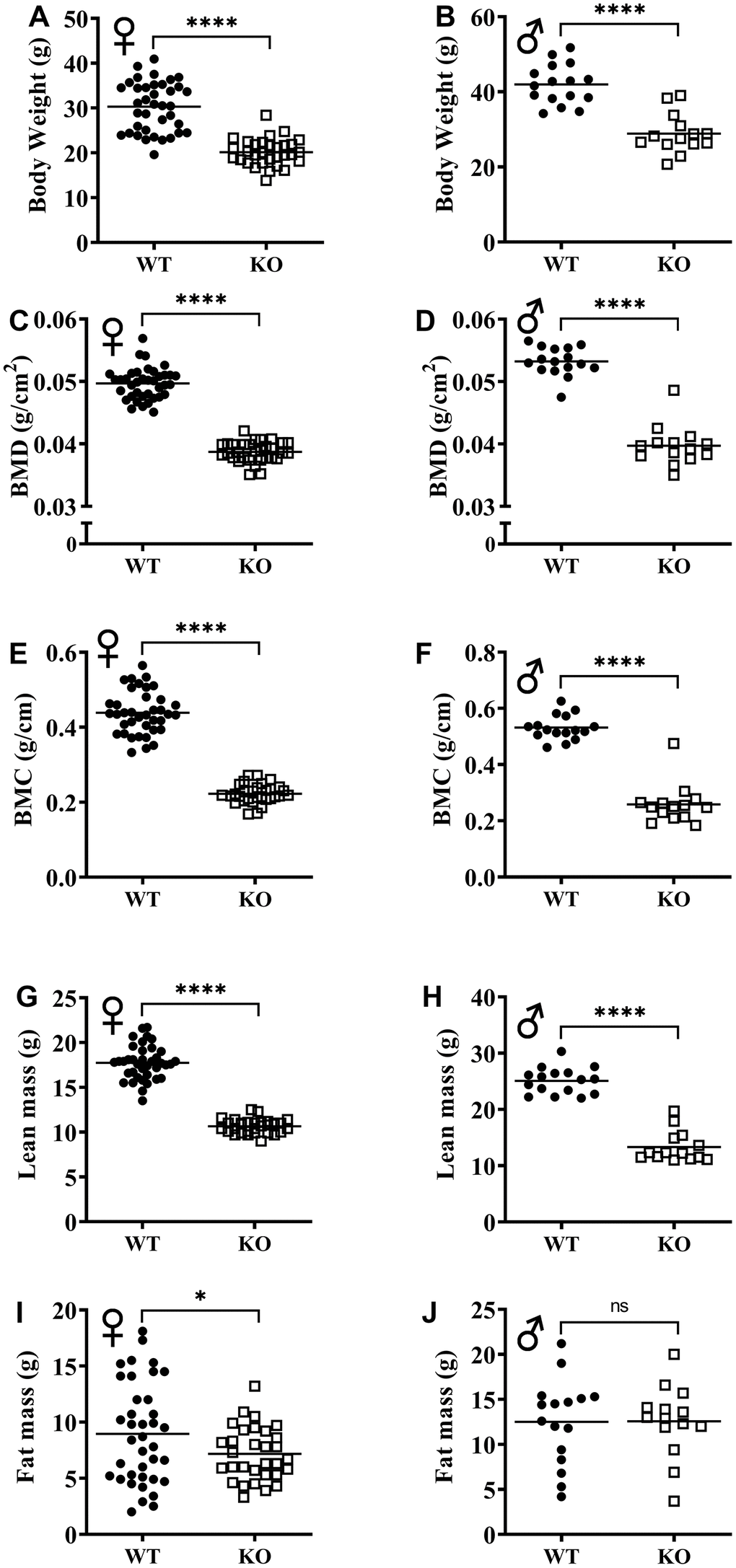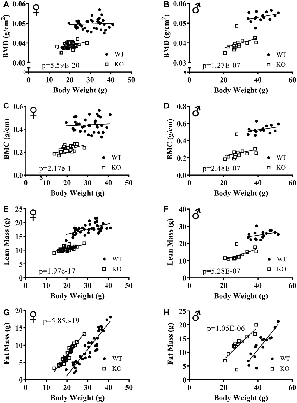 The effect of GH signaling on body weight (Figure 3A, 3B) and composition is well documented in GH related mutant mice [21–23]. Therefore, we performed dual-energy X-ray absorptiometry (DXA) to study the effects of reduced GH signaling on body composition parameters in our knockout model of GHRH. Absolute BMD, BMC, and lean mass values were significantly lower in both male and female GHRH-/- mice compared to WT littermates (Figure 3C–3H). In order to account for the significant body weight differences between GHRH-/- and WT mice, we used analysis of covariance (ANCOVA) method, which revealed that BMD, BMC, and lean mass were significantly reduced (Figure 4A–4F), whereas, fat mass was significantly increased in GHRH-/- mice (Figure 4G, 4H).