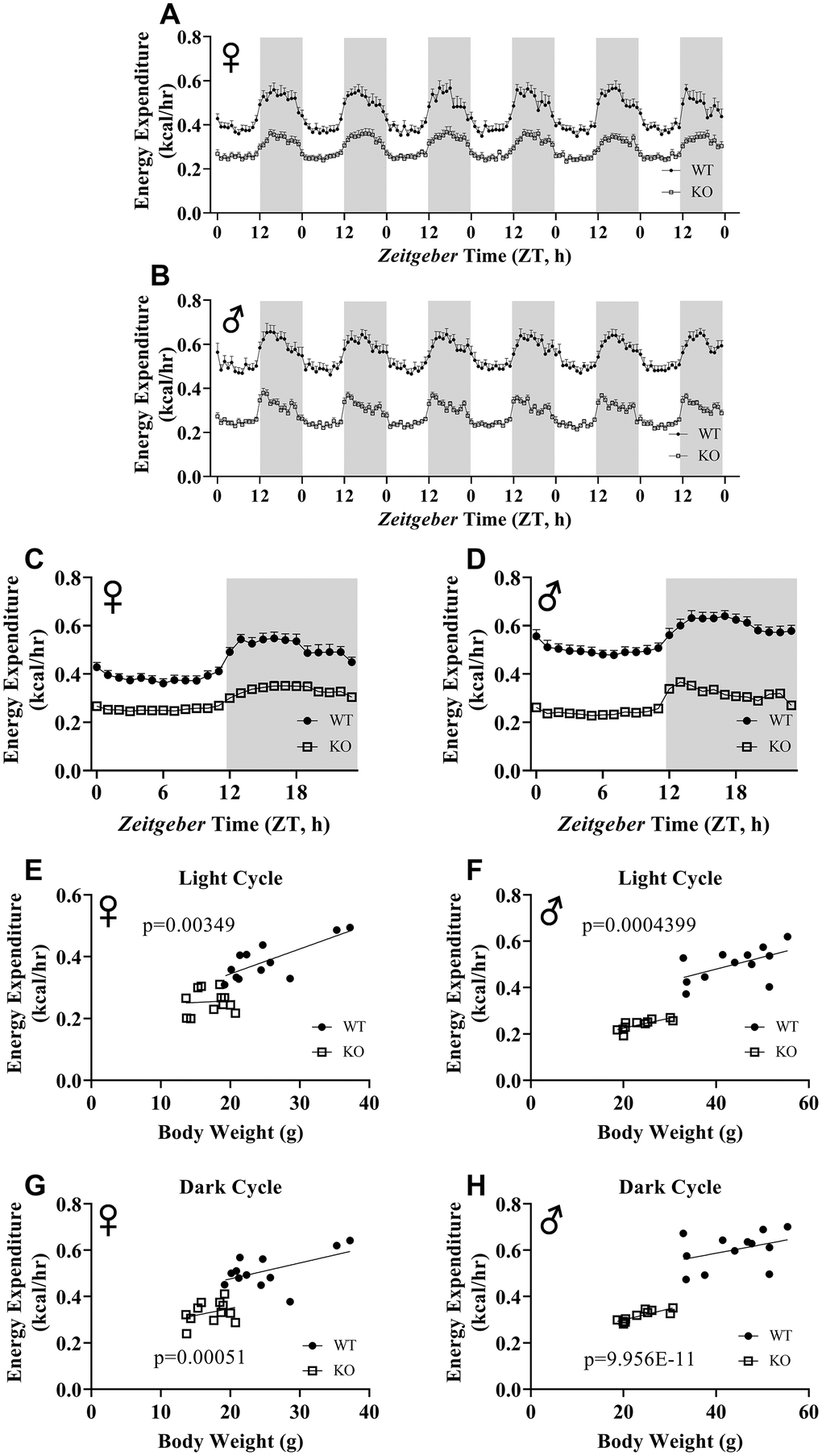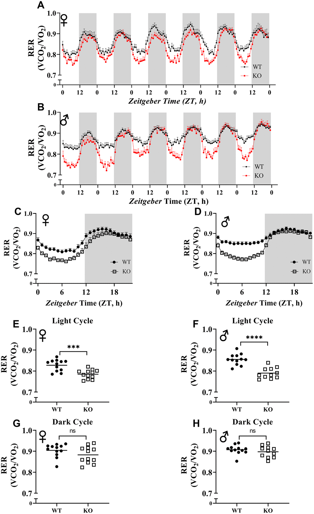 To explore the effect of GH deficiency on metabolic phenotype of mice, we measured RER using indirect calorimetry. Figure 5A, 5B provides overview of RER values for each hour recorded for 6 days for female and male mice, respectively. Notably, the RER of both male and female GHRH-/- mice decreased much more rapidly during the transition between dark and light cycles compared with WT littermates (Figure 5A, 5B). RER measurements collected for 6 days were averaged into a single day (Figure 5C, 5D). These results indicate lower RER for both male and female GHRH-/- mice compared to WT littermates during the light cycle, but not the dark cycle (Figure 5C, 5D). Comparisons of RER confirm that the significant differences in metabolism functions in a circadian manner (Figure 5E–5H).