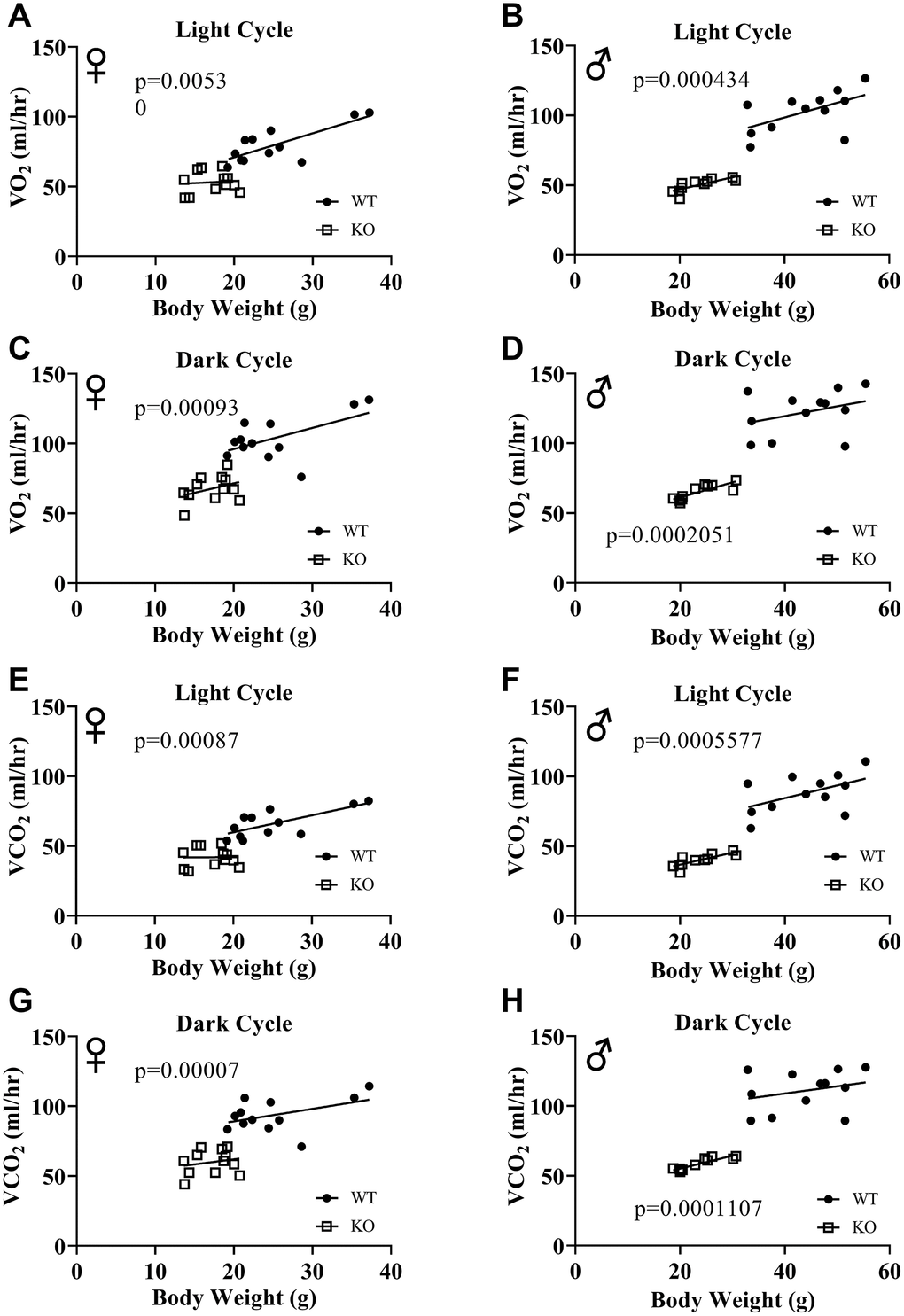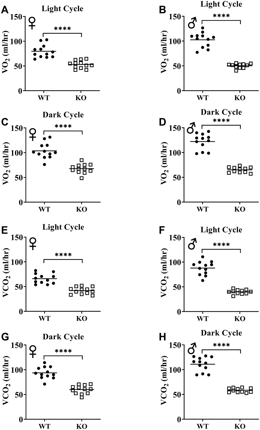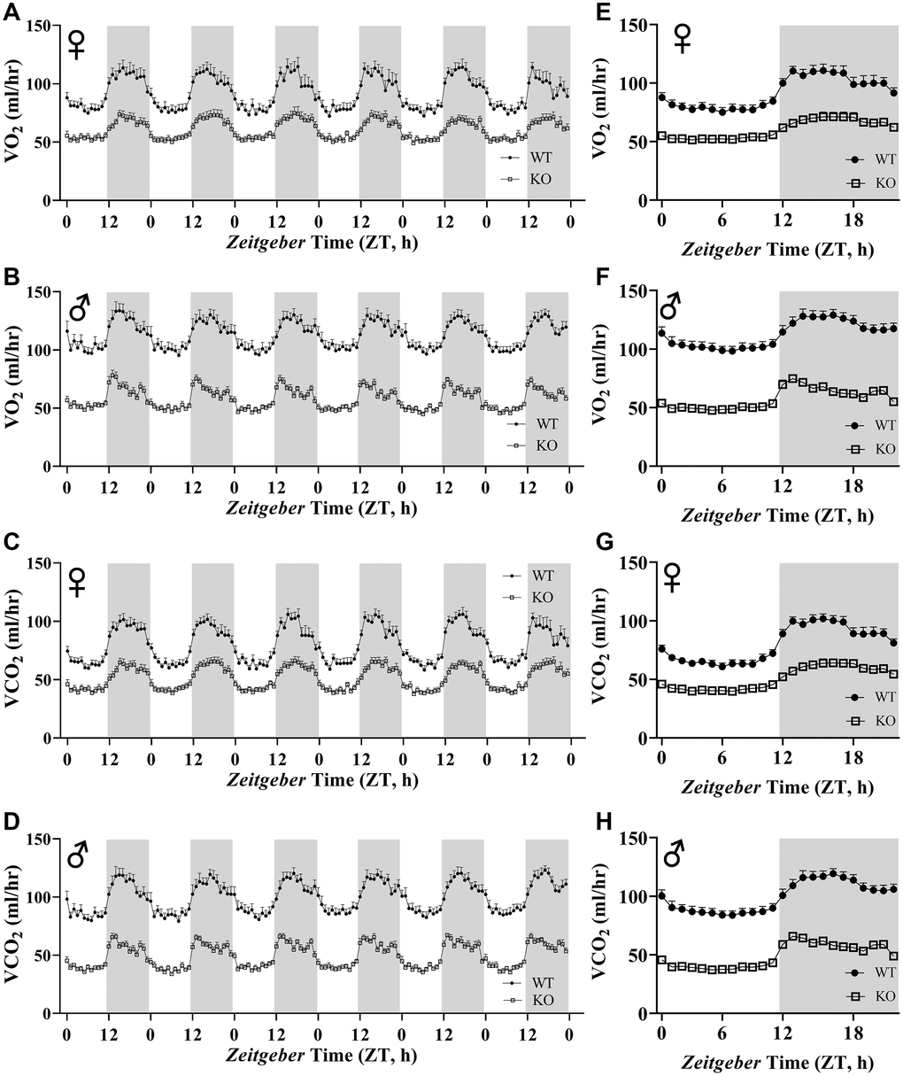 Figure 6A, 6B, 6E, 6F show mean hourly oxygen consumption (VO2) and carbon dioxide production (VCO2) of male and female mice for 6 days. All mice presented diurnal rhythm of higher VO2, VCO2 during the dark cycles compared to VO2, and VCO2 measured during the light cycles. Figure 5C, 5D, 5G, 5H show VO2 and VCO2 measurements collected for 6 days were averaged into a single day. Overall averages of absolute VO2 and VCO2 measurements were significantly lower in GHRH-/- female and male mice compared to WT littermates in both light and dark cycles (Figure 7A–7H). ANCOVA method, which controls for differences in body weight, showed male and female GHRH-/- mice have significantly lower VO2 and VCO2 compared to WT littermates, during both light and dark cycles (Figure 8A–8H).