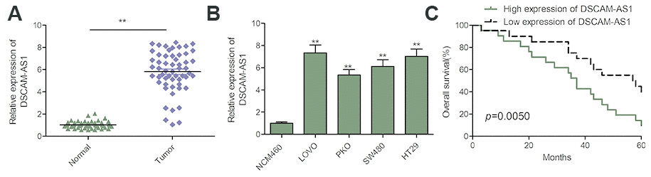 The expression of DSCAM-AS1 in 56 CRC tissues and adjacent normal tissues was detected, and we found a significant increase in its expression in CRC tissues (Figure 1A). We also detected the expression of DSCAM-AS1 in CRC cell lines and found that in 4 CRC-derived cell lines (LOVO, PKO, SW480 and HT29) DSCAM-AS1 expression was significantly higher than in the normal human colon epithelial cell line NCM460 (Figure 1B).