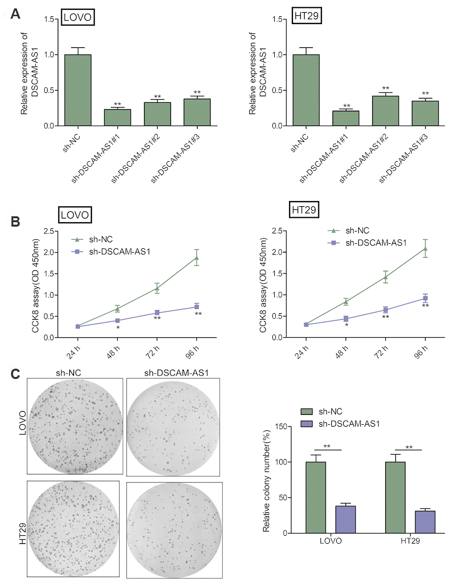 To study the role of DSCAM-AS1 in CRC, we performed loss-of-function experiment by downregulating the expression of DSCAM-AS1 in LOVO and HT29 cells using sh-DSCAM-AS1#1, sh-DSCAM-AS1#2 and sh-DSCAM-AS1#3. As seen in Figure 2A, the three shRNAs significantly inhibited DSCAM-AS1 expression in LOVO and HT29 cells. Due to the efficiency of knockdown, we chose sh-DSCAM-AS1#1 as the DSCAM-AS1 down-regulation for subsequent studies, and named as: sh-DSCAM-AS1. CCK8 assay indicated that DSCAM-AS1 knockdown resulted in a significant inhibition of proliferation of LOVO and HT29 cells (Figure 2B). Consistent with this result, depletion of DSCAM-AS1 obviously decreased colony formation of LOVO and HT29 cells (Figure 2C).
