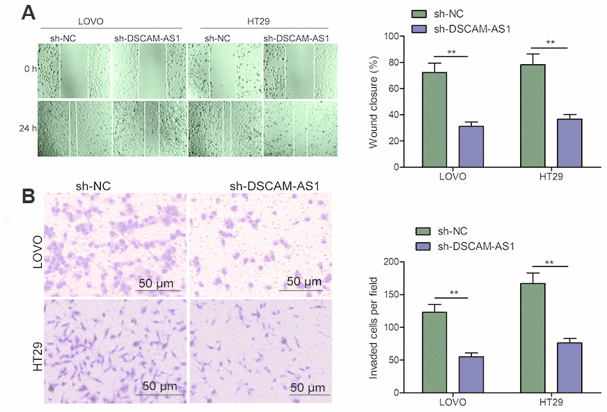 The effect of DSCAM-AS1 knockdown on cell invasion was studied using transwell assay and its effect on migration was determined by the wound healing assay. As seen in Figure 3A, down-regulation of DSCAM-AS1 markedly decreased cell migration ability of LOVO and HT29 cells. DSCAM-AS1 depletion also inhibited the cell invasion ability when compared to sh-NC group (Figure 3B). These indicated that downregulation of DSCAM-AS1 suppressed CRC cell metastasis.