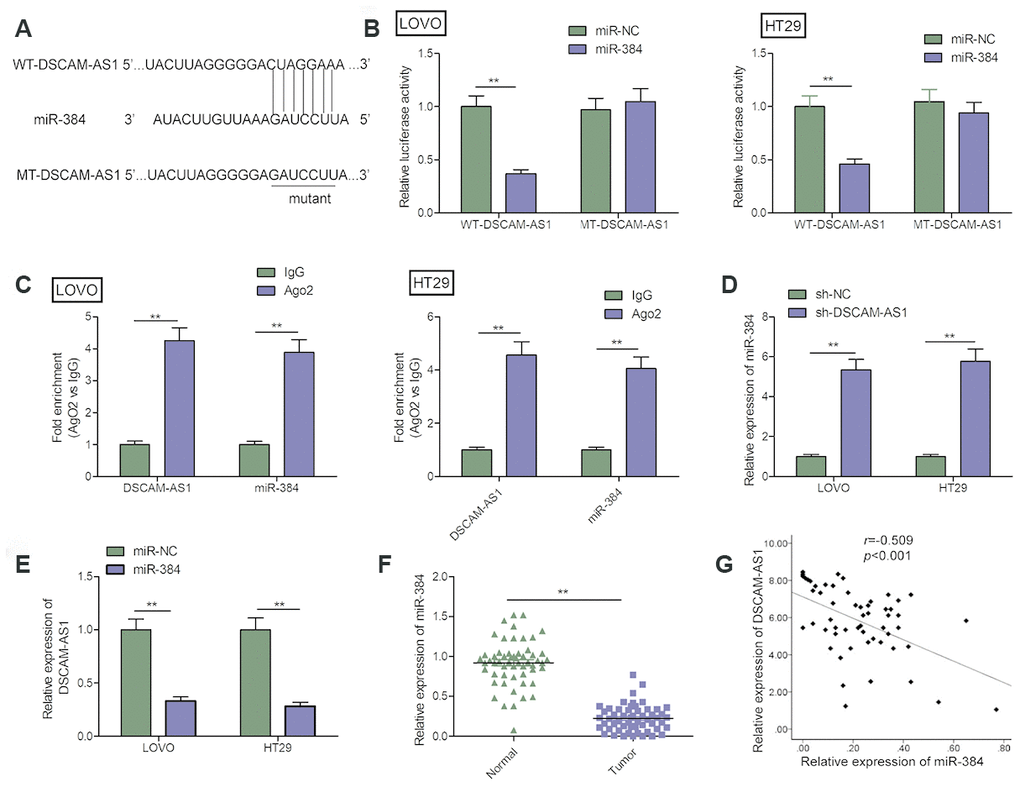 Emerging studies reveal lncRNA could directly bind to miRNAs and function as a molecular sponge during tumorigenesis [19, 20]. We further investigated the regulatory mechanism of DSCAM-AS1 in CRC. Through bioinformatics analysis using starBase V2 tool, we found that there are miR-384 binding sites in the DSCAM-AS1 sequence (Figure 4A). To test this predication, luciferase reporter assay was carried out and we found that miR-384 over-expression resulted in a significant suppression of the activity of WT-DSCAM-AS1 reporter plasmid in LOVO and HT29 cells (Figure4B). Furthermore, RIP assay demonstrated that DSCAM-AS1 and miR-384 were remarkably clustered in Ago2 immunoprecipitate in comparison with the IgG-pellet, indicating they enriched in the same RNA-induced silencing complex (RISC) (Figure 4C). Furthermore, qRT-PCR analysis showed that DSCAM-AS1 knockdown increased miR-384 expression in LOVO and HT29 cells (Figure4D), while overexpression of miR-384 inhibited DSCAM-AS1 expression in LOVO and HT29 cells (Figure 4E). Moreover, we discovered that there was a downregulation of miR-384 expression in CRC tissues (Figure 4F), and there was negative correlation with DSCAM-AS1 in CRC tissues (Figure 4G).
