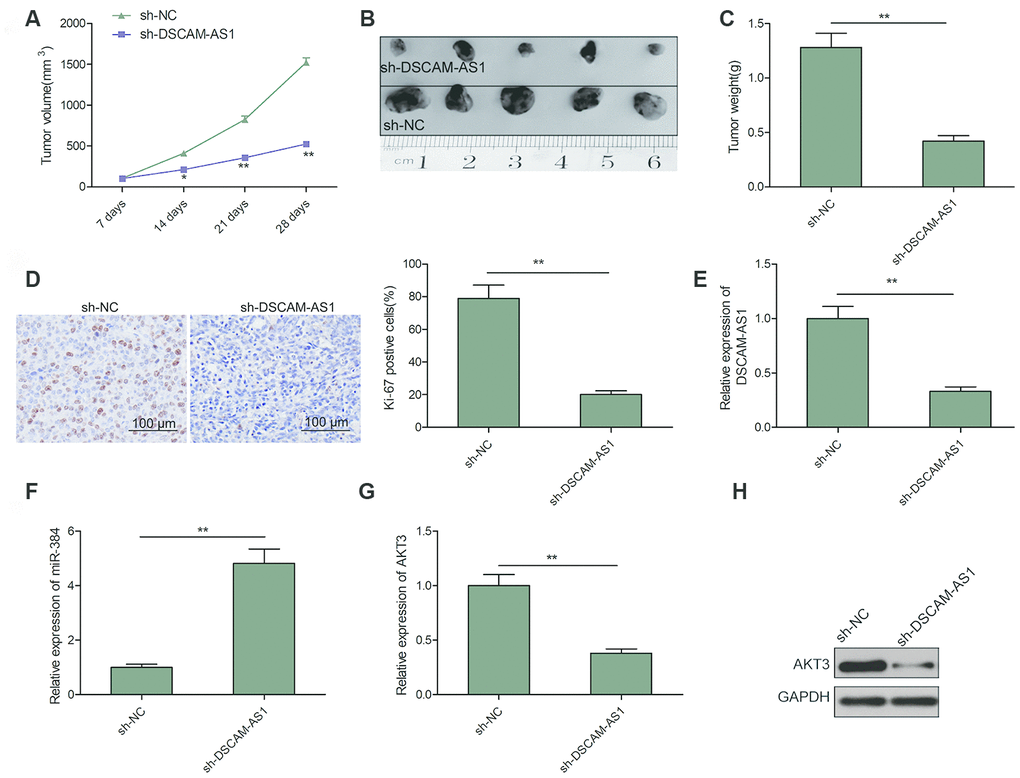 The tumor xenograft assay was done to study the impact of DSCAM-AS1 knockdown on CRC tumor growth in vivo. As seen in Figure 6A–6C, nude mice injected with sh-DSCAM-AS1/LOVO cells had smaller tumors, both in volume and weight, when compared to mice injected with sh-NC/LOVO cells. Moreover, we found that the Ki-67 positive cells were significantly decreased in sh-DSCAM-AS1/LOVO group when compared to sh-NC/LOVO group (Figure 6D). We also found that DSCAM-AS1 and AKT3 expression was downregulated, while miR-384 was upregulated in xenograft tumor of sh-DSCAM-AS1/LOVO group when compared to sh-NC/LOVO group (Figure 6E–6H). The in vivo data therefore complemented the description about biological role of DSCAM-AS1.